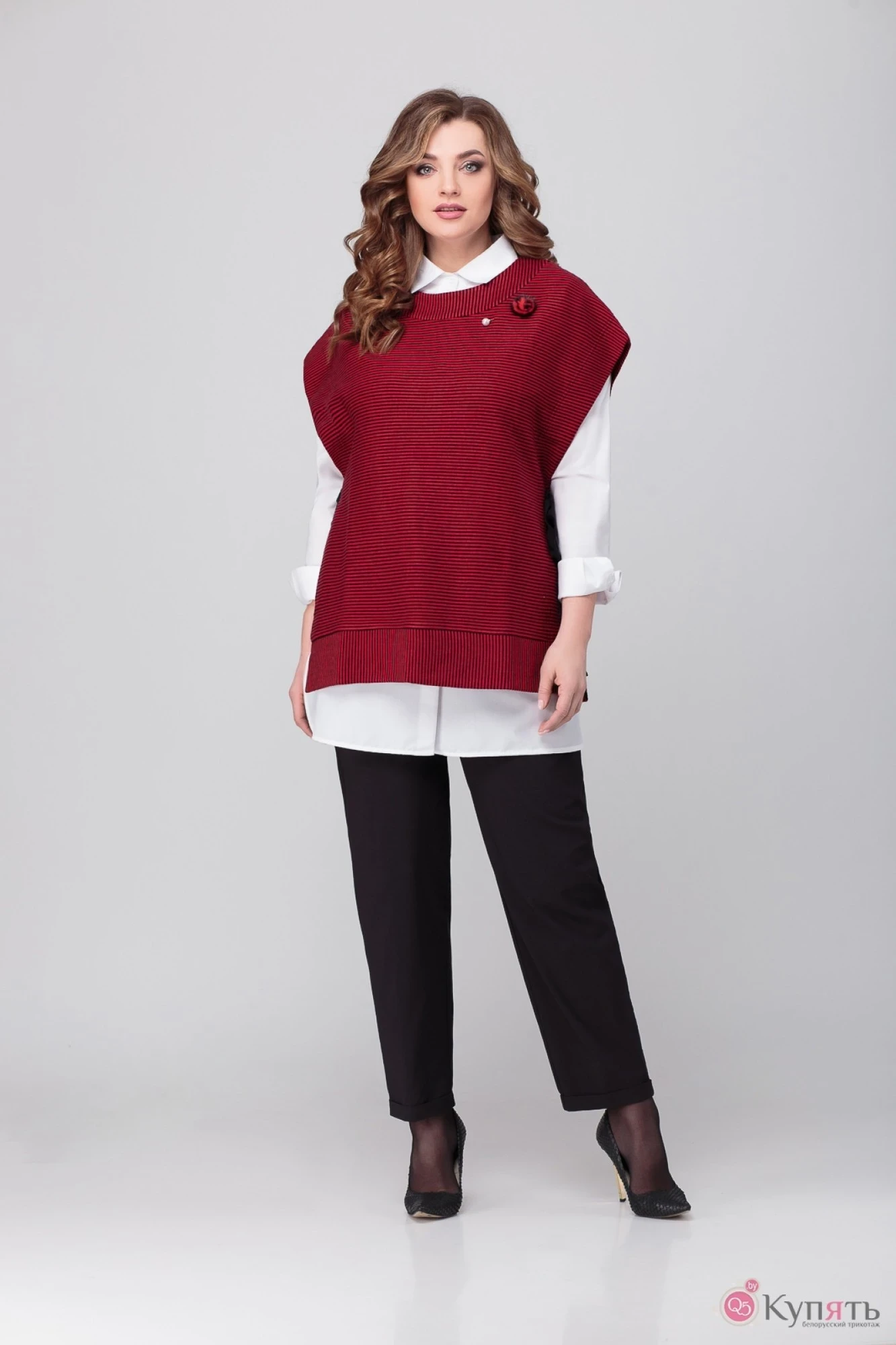 Комплект женский из жилета и брюк. Жилет из трикотажного полотна в полоску. Жилет со спущенной линией плеча, в боковых швах обработаны завязки в виде хлопковой тесьмы. В комплекте прилагается брошь. Брюки выполнены из текстильного полотна. Посадка втачного пояса на резинке на линии талии. Брюки со складками род поясом спереди и с боковыми наклонными карманами. Сзади на брюках обработаны карманы с листочками.
