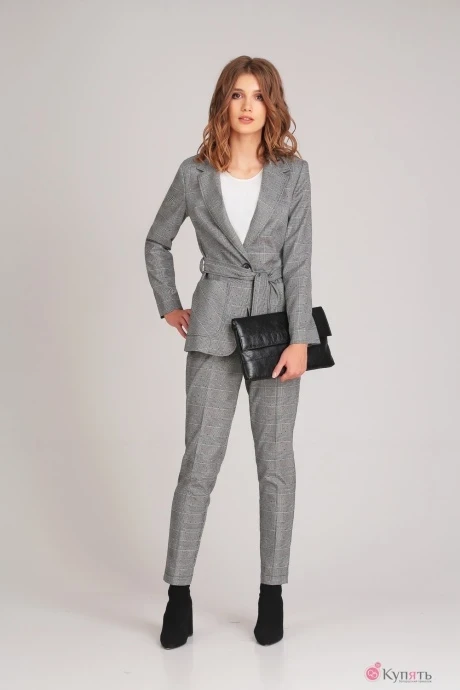 Комплект из ткани в клетку, состоит из жакета и брюк. Жакет полуприлегающий, на подкладке. Застежка в размерах 44, 46, 48 на одну пуговицу, в размерах 50, 52, 54 на две пуговицы. Карманы накладные. Жакет с поясом. Брюки зауженные к низу, с карманами в боковых швах. Пояс брюк на резинке. Линия посадки занижена.