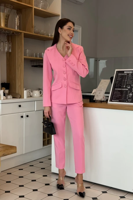 Жакет однобортный, обработан подкладкой. Рукав втачной, одношовный, прямой, обработан шлицей с пуговицами. По переду имеются рельефы, карманы оработаны клапанами. Воротник классический, исходящий из рельефов. Пуговицы в цвет изделия Брюки прямого кроя, длинна 7/8, застёжка- гульфик , по боковым швам обработаны карманы
