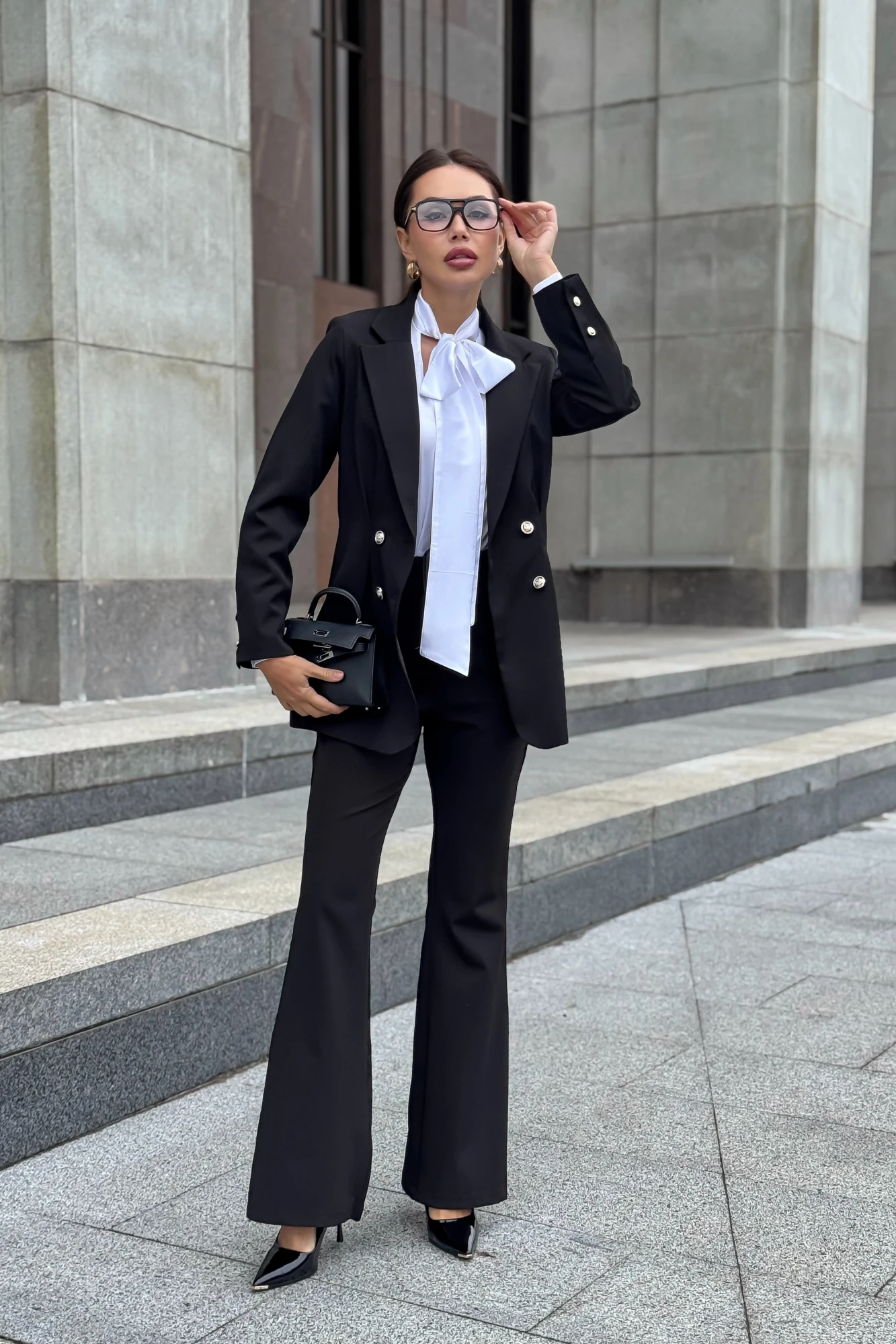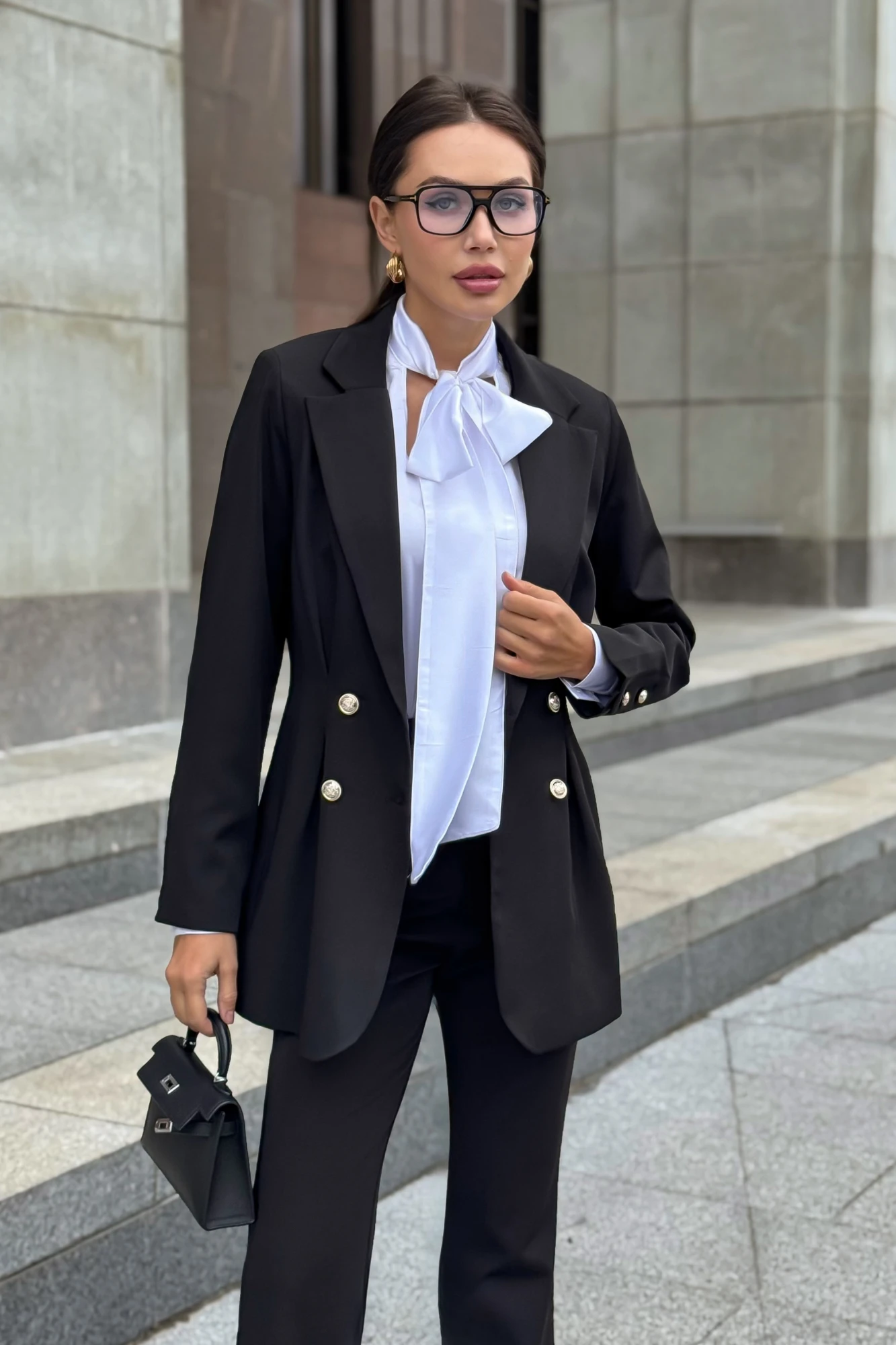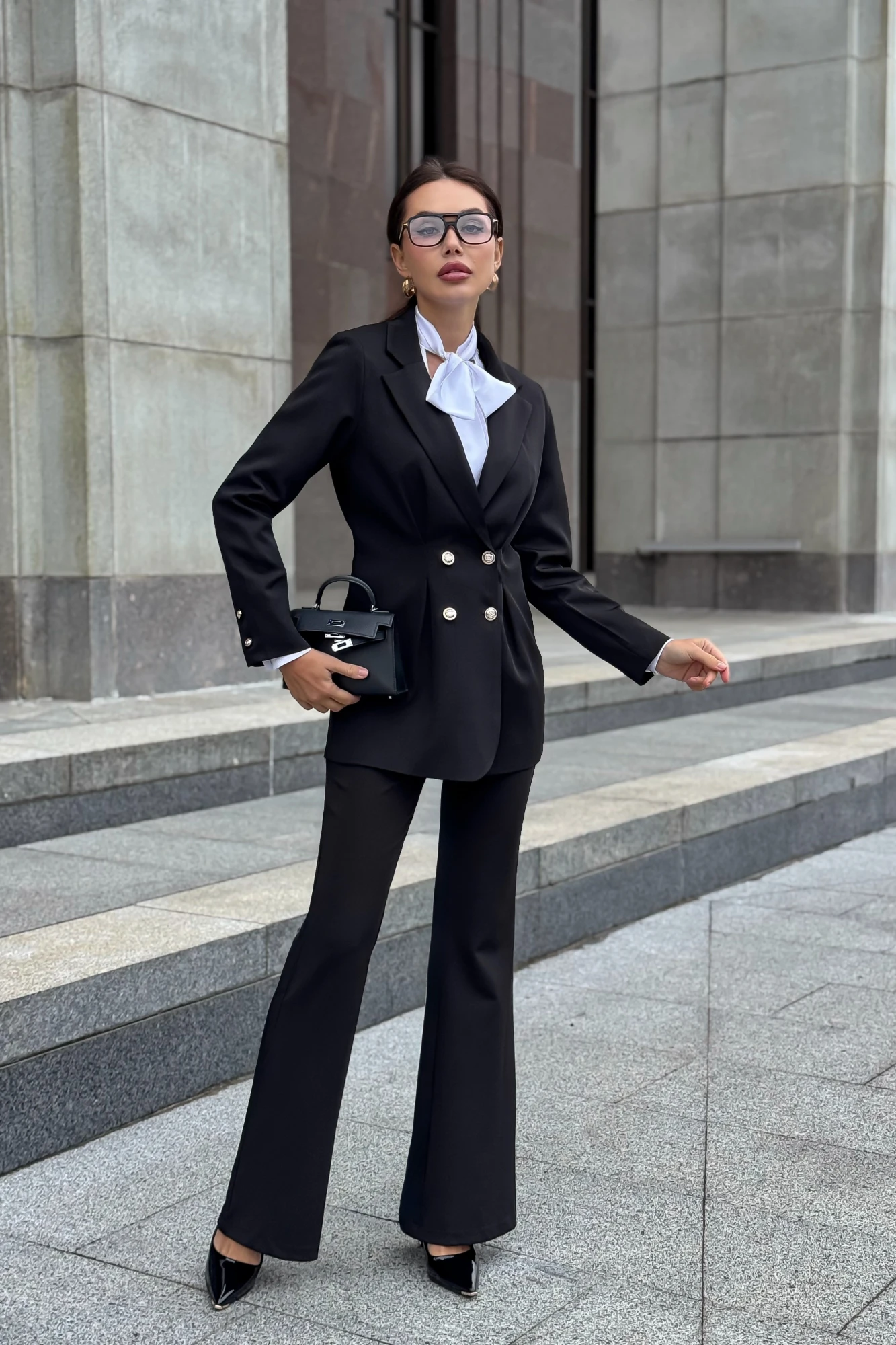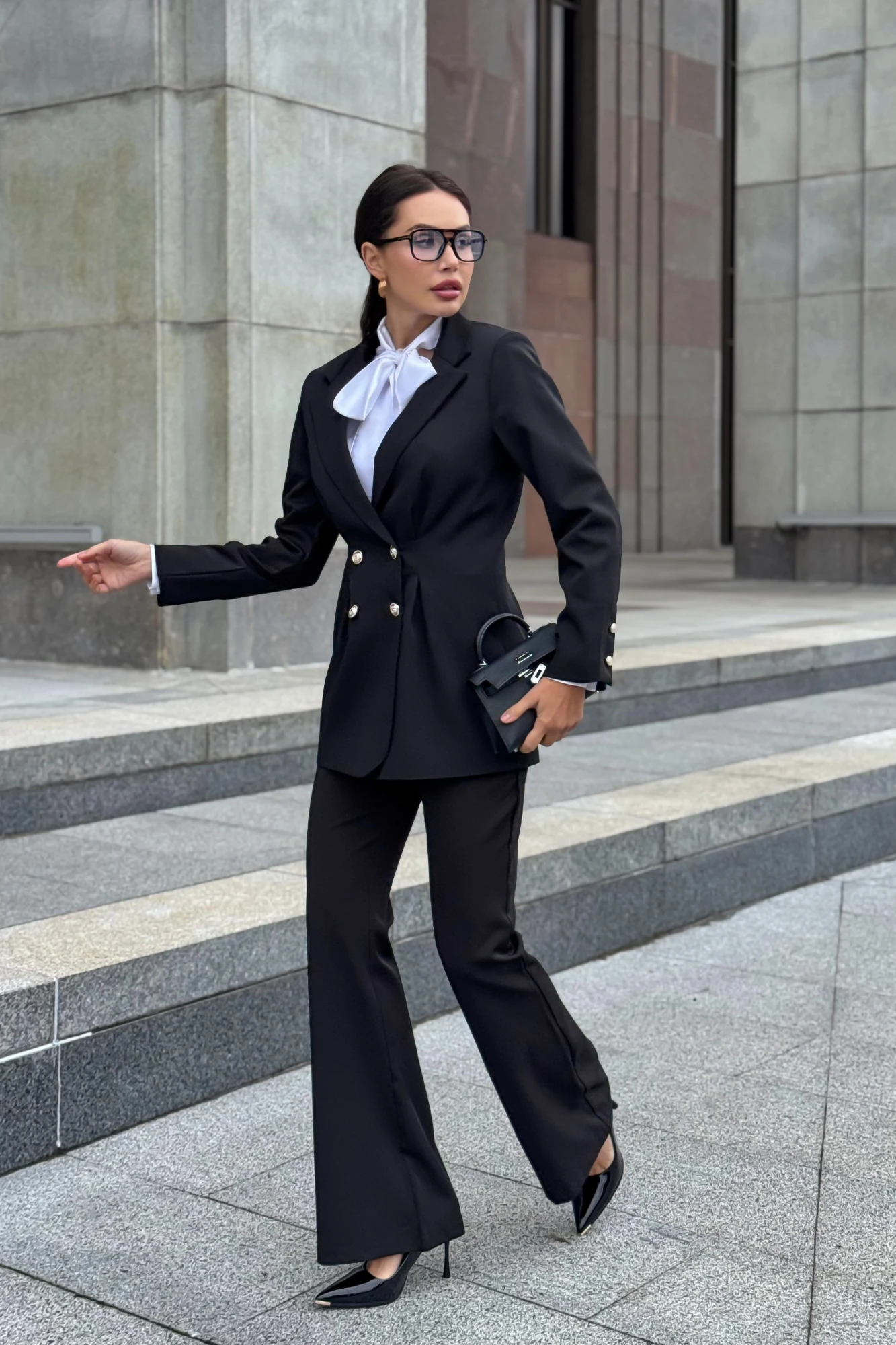 Комплект 2-х предметный. Состоит из жакета и брюк. Жакет однобортный, на подкладке, обработаны защипы на линии талии. Воротник костюмный, рукав втачной, прямой, лдношовный, обаботан шлицей. Фурнитура - пуговицы золотистого цвета. Брюки классические, по форме прямые, клешенные от лиии колена, застежка - потайная молния. Съёмный пояс из основной ткани, обработан пряжкой - в комплекте