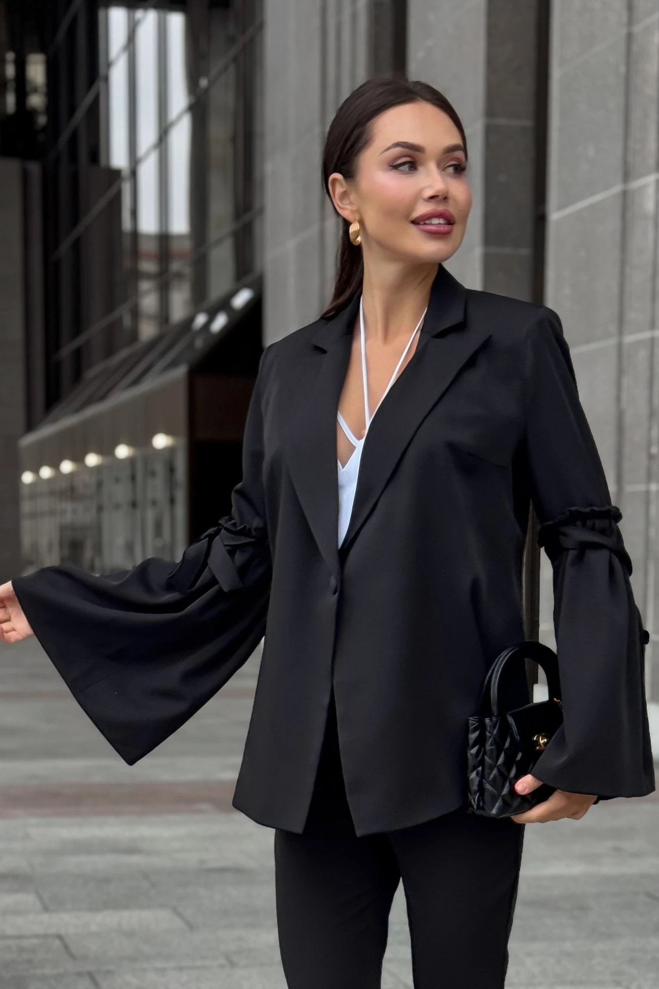 Костюм 2-х предметный. Жакет однобортный свободнго силуэта. Жакет обработан подкладкой. Рукав прямой, длинный, втачной, отрезной с пришитой присборенной деталью, шнурком из основной ткани для завязывания. Брюки классические, по форме прямые, клешенные от лиии колена, застежка - потайная молния. Съёмный пояс из основной ткани, обработан пряжкой - в комплекте