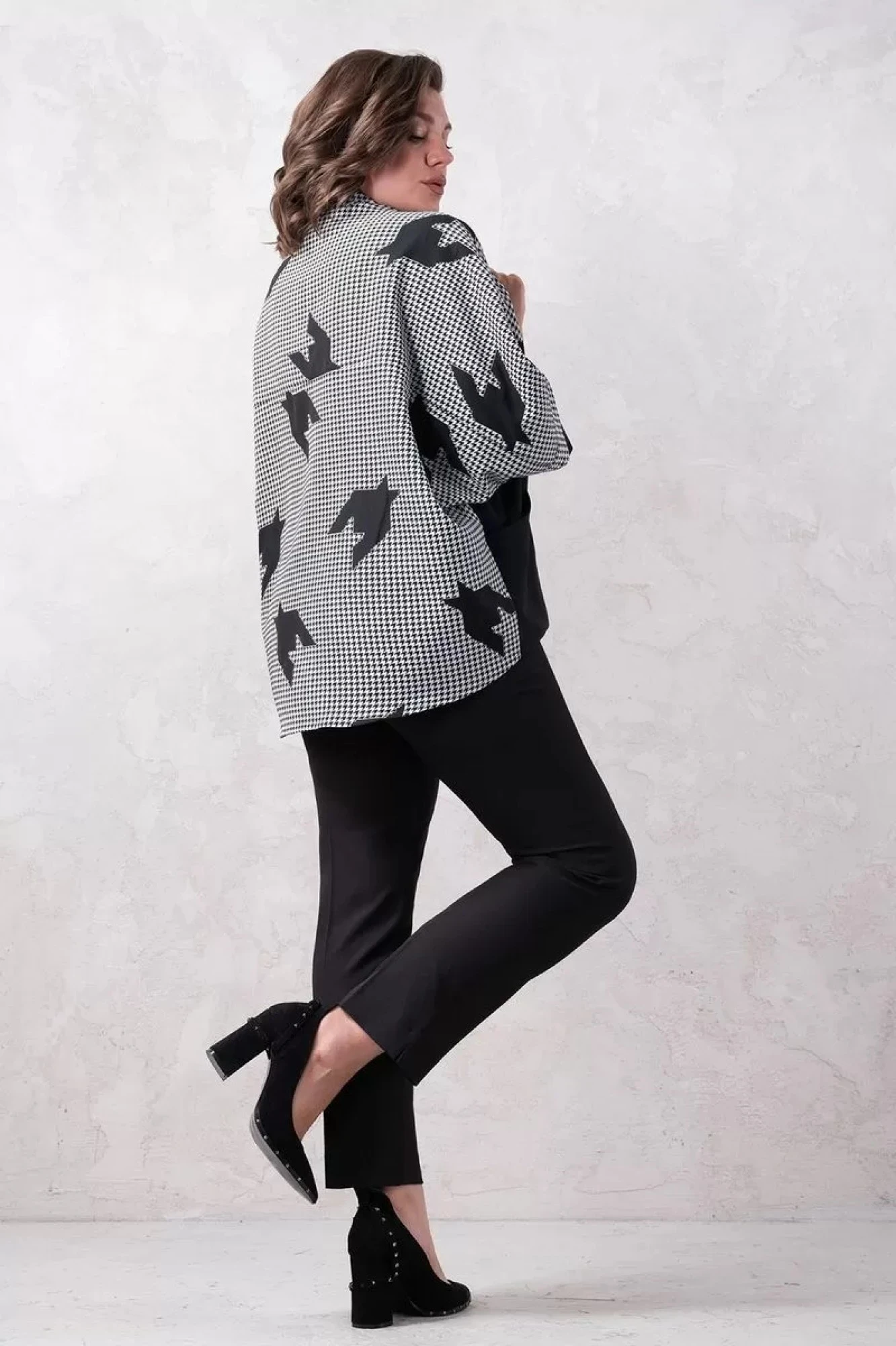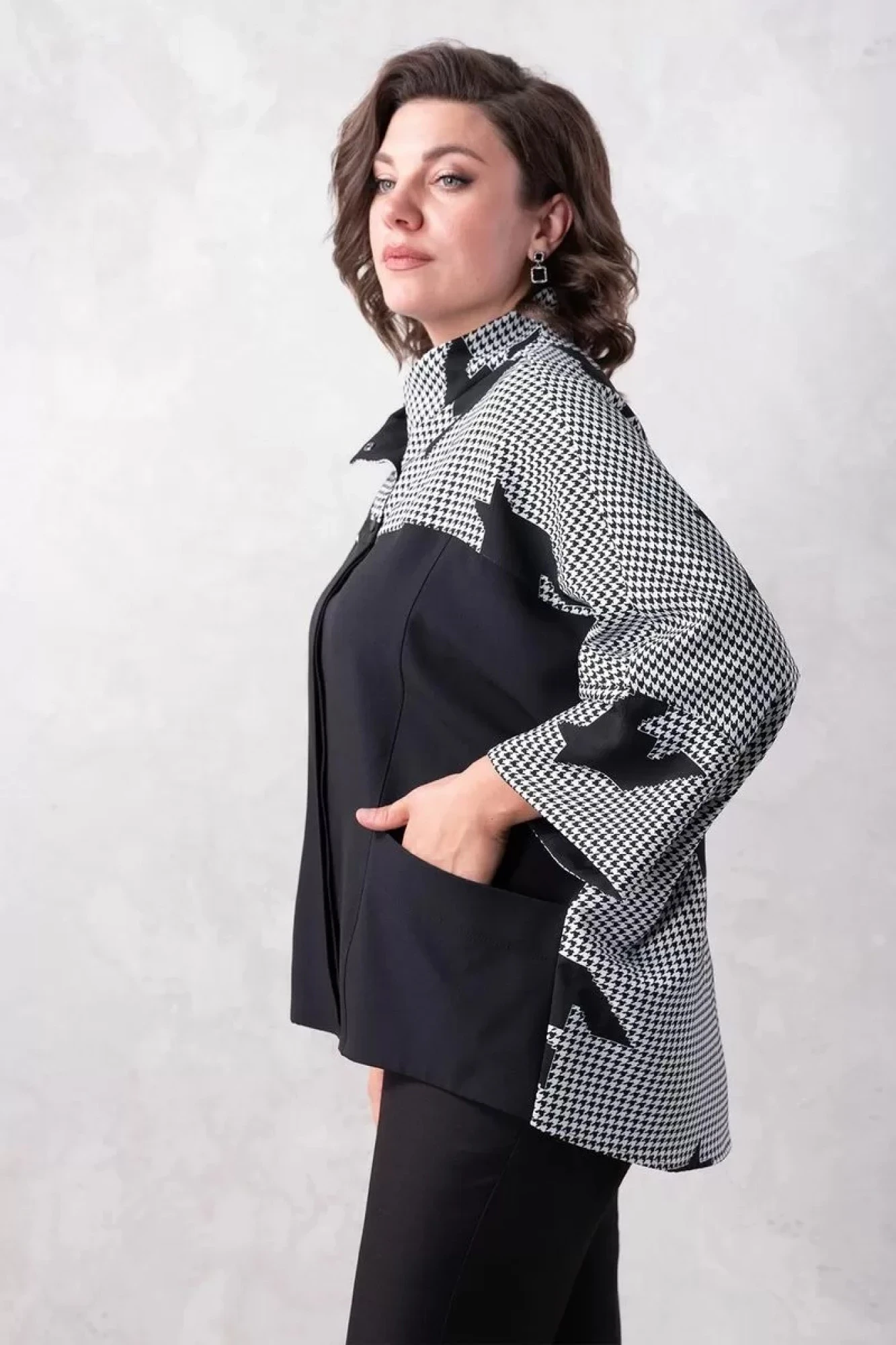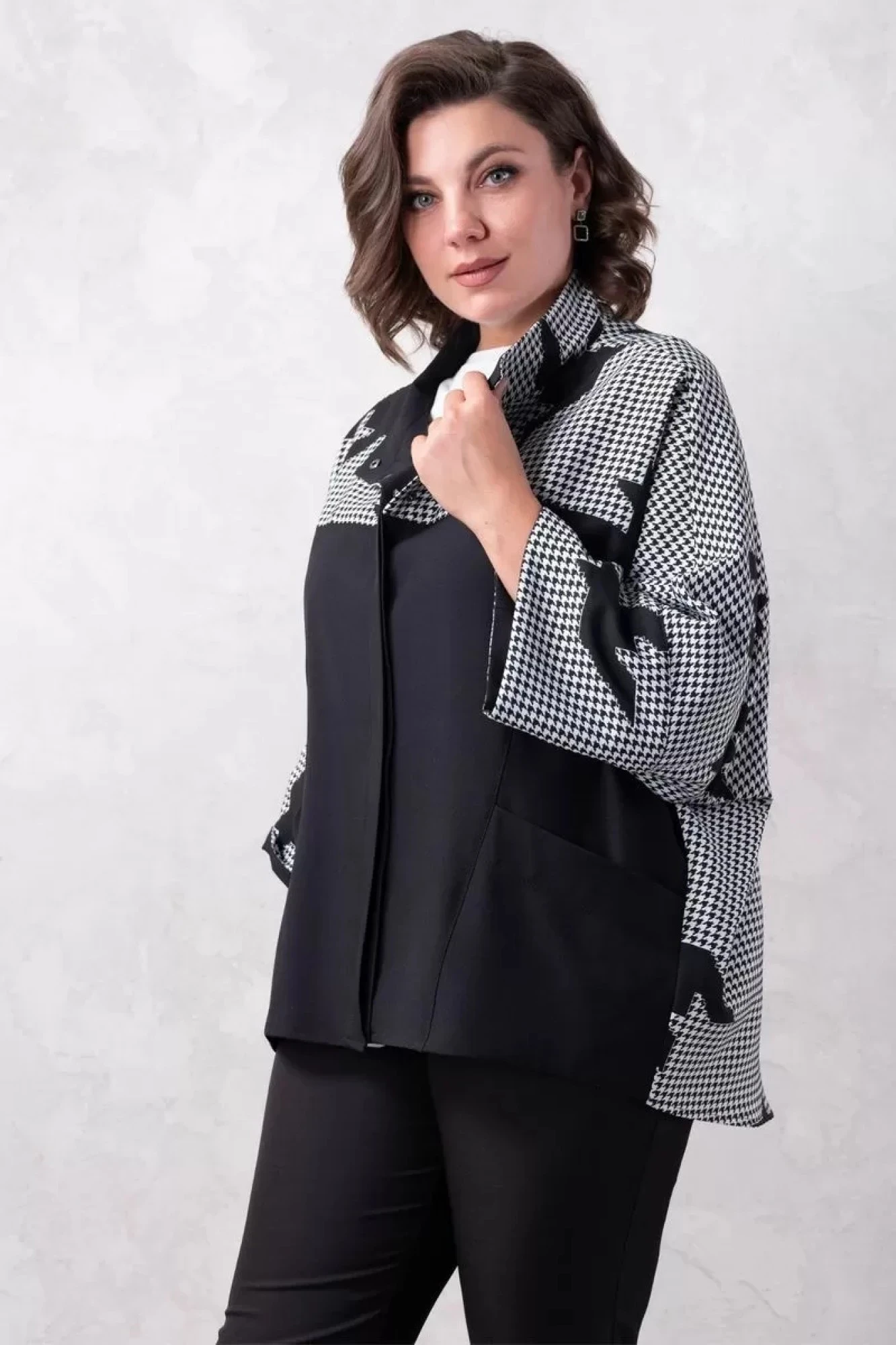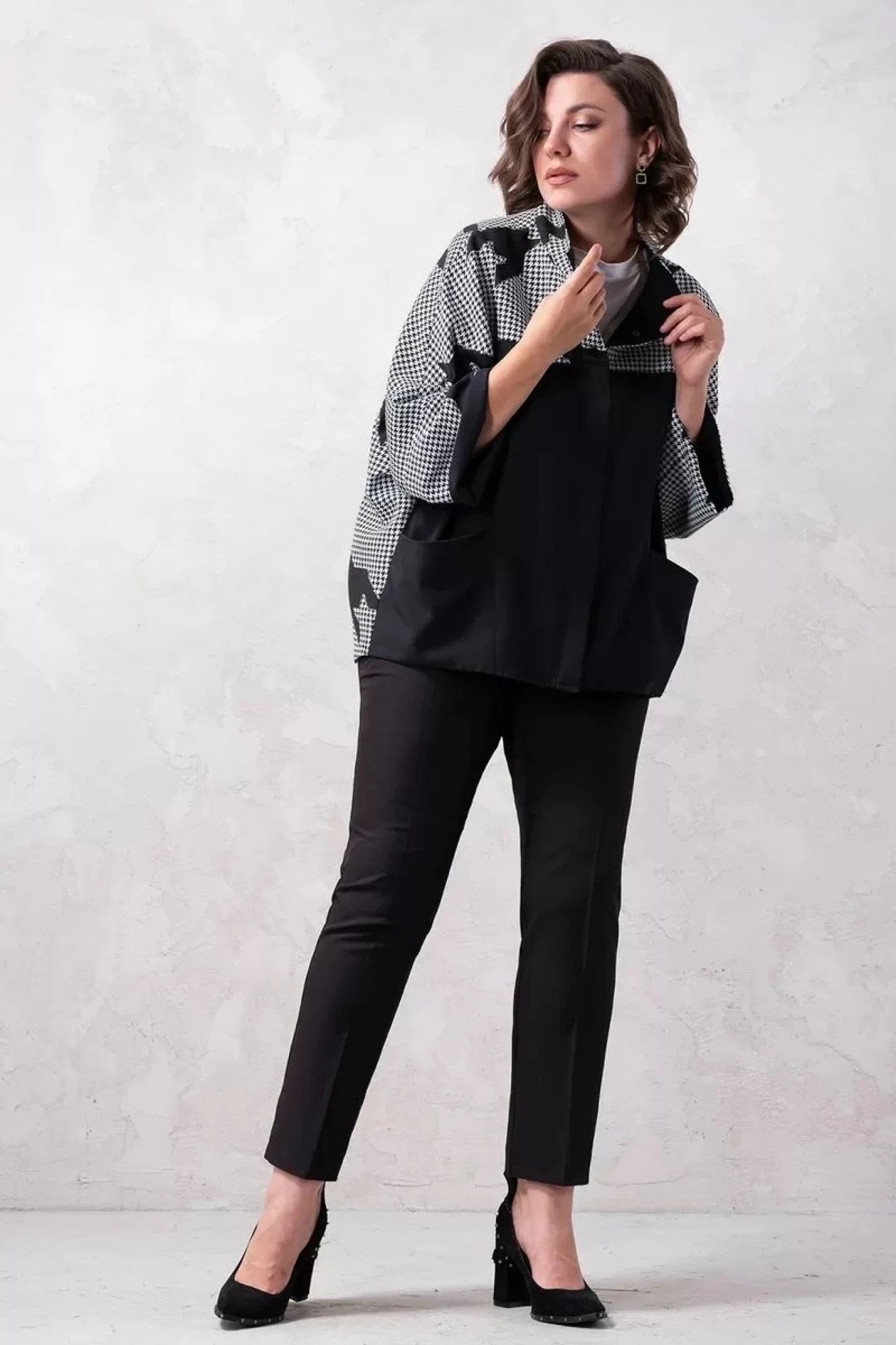 Комплект двойка: брюки+жакет. Брюки классические, застежка спереди на молнию, в боковых швах удобные карманы. Ткань костюмно-плательная средней плотности, немного тянется. Длина по боковому шву 103 см. Жакет оверсайз, ткань костюмно-плательная средней плотности. Изделие без подклада. Рукав цельнокроенный, длина 7/8. Потайная застежка спереди на пуговицы, на переде удобные карманы.