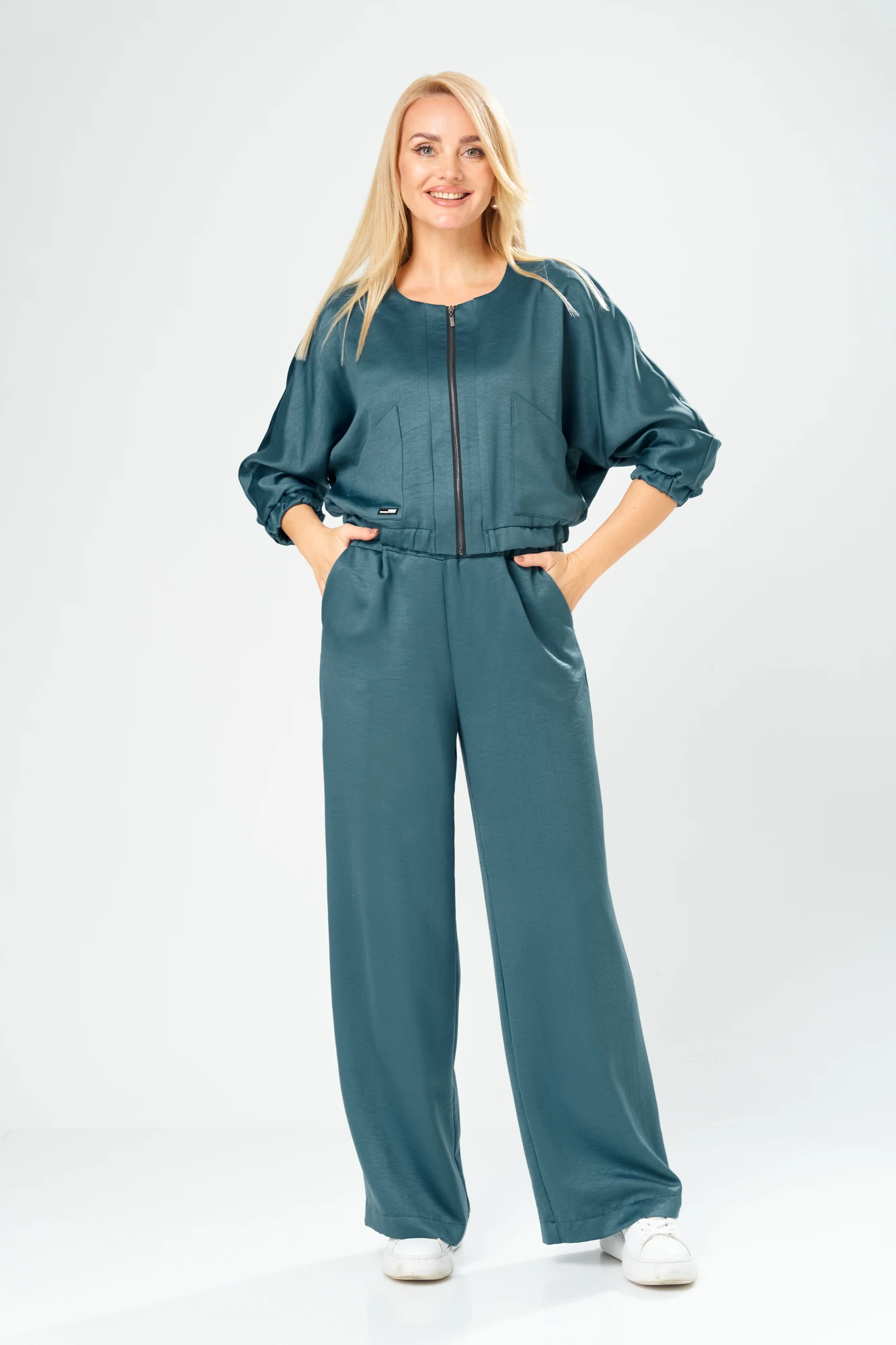 Брючный комплект в городском стиле от бренда АХХА идеально подойдет для тех, кто ценит комфорт и стиль. Он выполнен из мягкого, уютного сатина, приятного к телу, не мнется, что позволит сохранить опрятный вид в течении дня. Комплект состоит из широких брюк и укороченного бомбера на молнии, декорированного накладными карманами. Свободные брюки с поясом на резинке в стиле палаццо визуально стройнят и вытягивают фигуру, а также обеспечивают свободу движения и удобство. В боковых швах брюк выполнены удобные функциональные карманы.