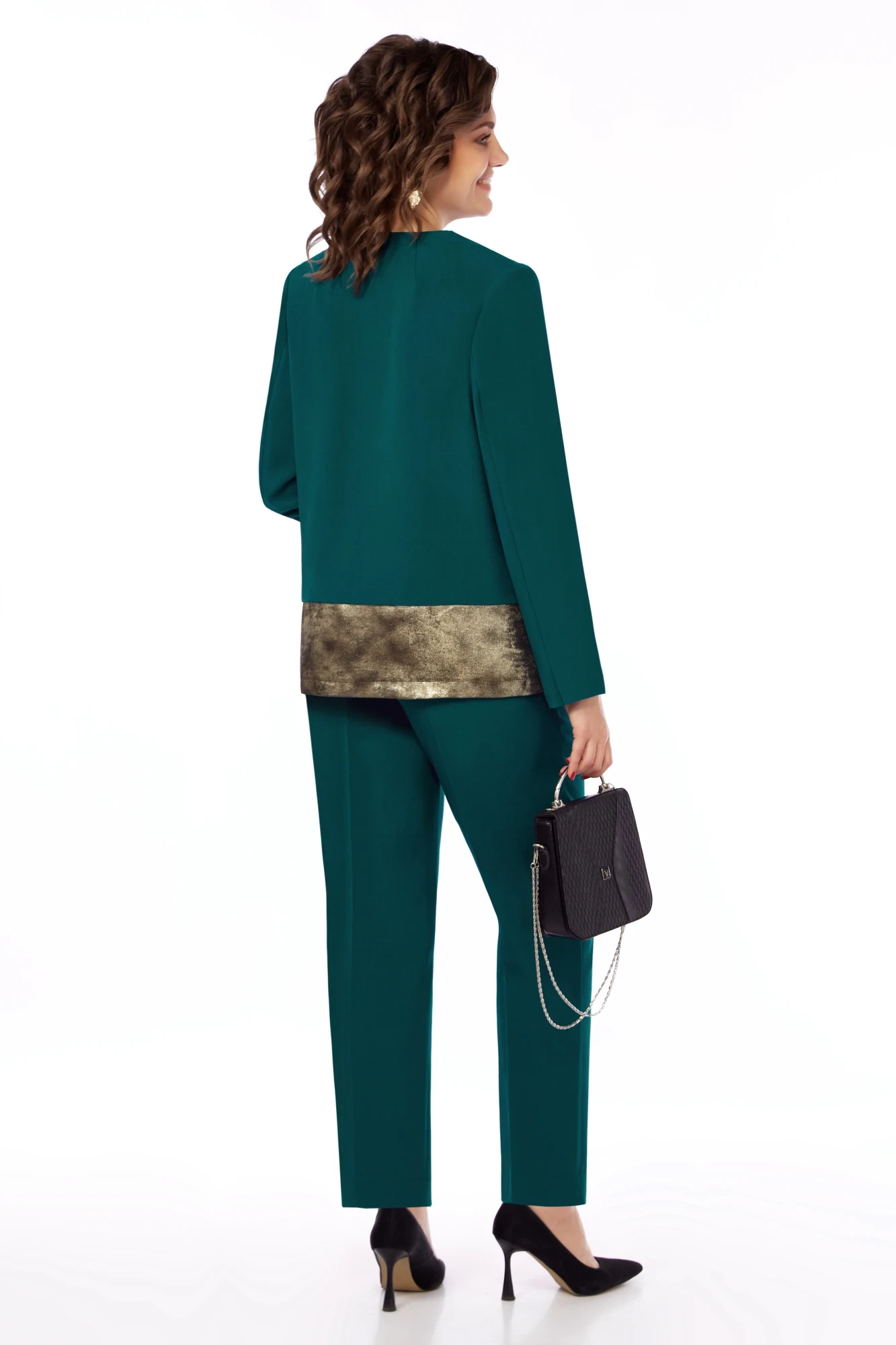 Нарядный женский трехпредметный комплект состоит из жакета и брюк, выполненных из плательно-костюмной ткани и топа ,выполненного их лёгкой ткани с золотым принтом.