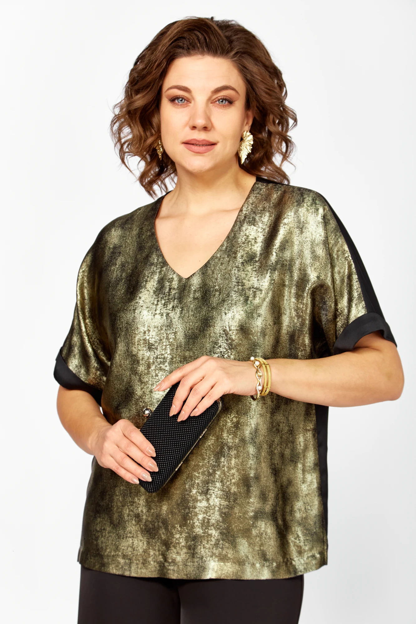 Блуза прямого силуэта со спущенными плечами и рукавами летучая мышь с отложными манжетами. Этот крой красиво подчеркивает достоинства и скрывает недостатки любой фигуры. V-образный вырез горловины визуально удлиняет шею и деликатно открывает декольте. По бокам разрезы высотой 5.5см. Блуза выполнена из двух видов ткани: перед - из блузочной ткани с эффектом патины,а спинка и манжеты- из шёлка Армани - это ткань, напоминающая натуральный шелк, отличается элегантностью, мягкостью и блеском, но при этом более доступна по цене и практична в уходе.