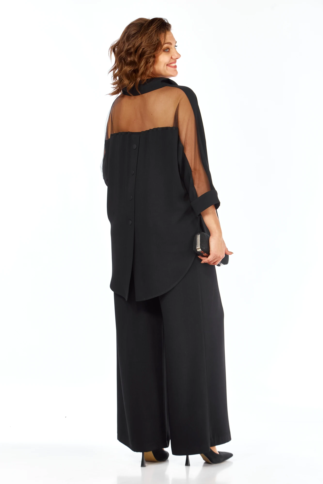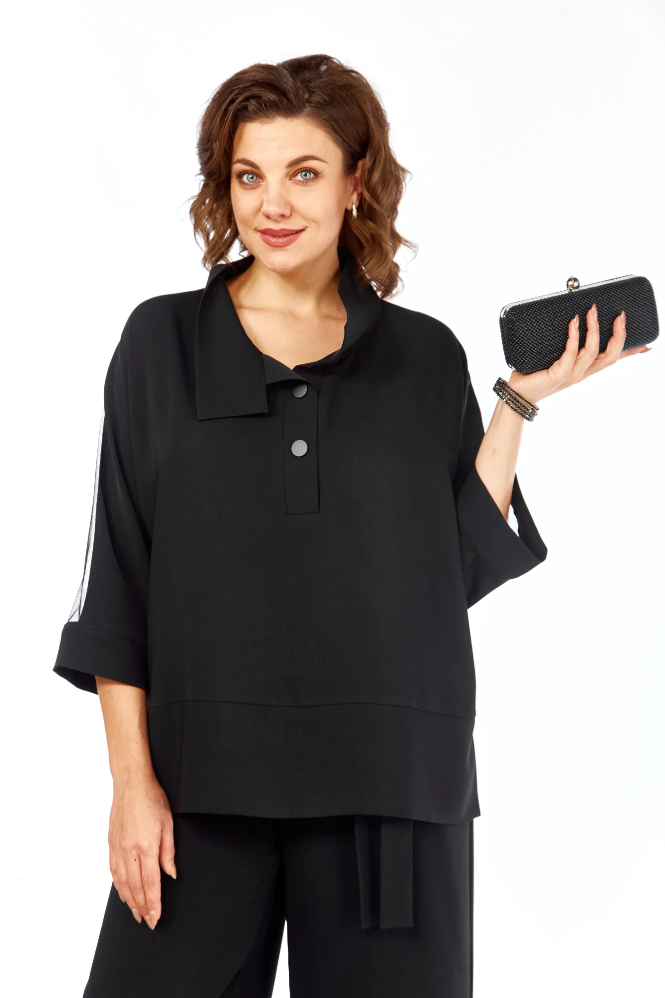 Блуза прямого силуэта, "оверсайз", с цельнокроеным рукавом длиной 3/4, заканчивающимся притачной манжетой, выполнена из двух видов ткани. Перед с притачной горизонтальной планкой по низу, разрезами в боковых швах и втачной планкой по горловине, застёгивающейся на 2 кнопки. Воротник - стойка. Спинка удлиненная,с отрезной кокеткой из сетки, нижняя часть спинки с центральной застёжкой на 4 кнопки.Низ спинки фигурный.