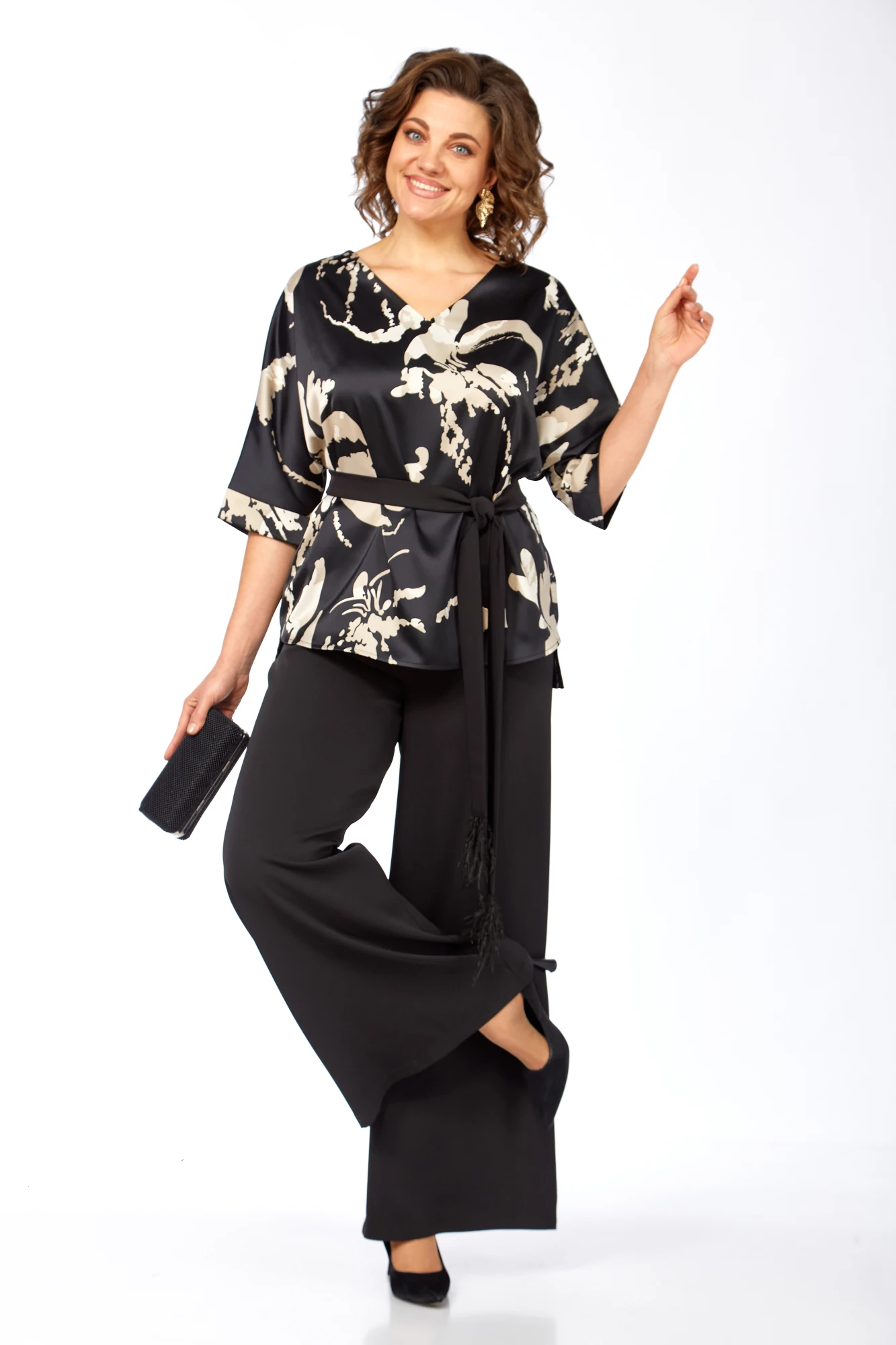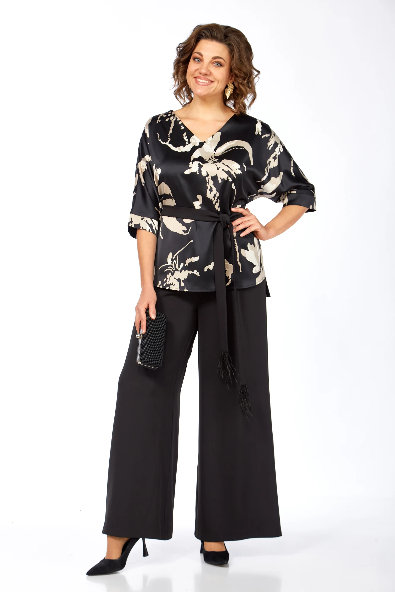 Нарядный женский комплект состоит из свободной блузы и широких брюк "палаццо", выполнен из двух видов ткани.