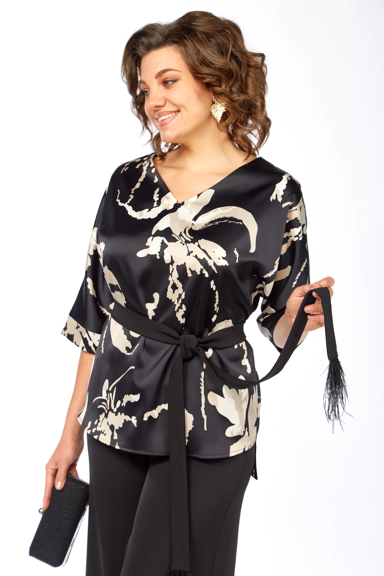 Блуза прямого силуэта с цельнокроеными рукавами "летучая мышь", выполнена из плотного сатина с оригинальным дизайном. Низ асимметричный,по переду закруглённый окантован ламовкой,по спинке прямой удлинённый. V-образный вырез горловины обтачен по переду и окантован ломовкой по спинке. Рукава длиной 3/4. Низ на притачных манжетах.