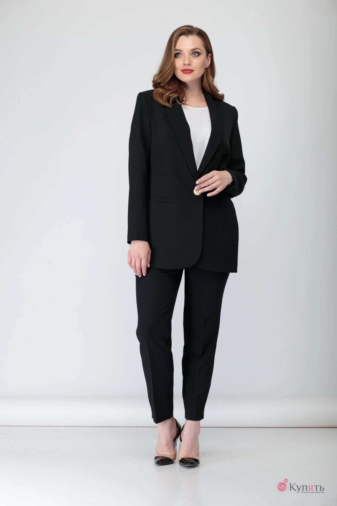 Комплект женский, трехпредметный. Жакет: Прямого силуэта. Спинка со средним швом. Перед с нагрудной вытачкой от бокового шва. По переду обработаны прорезные карман с встрочнй листочкой. Застежка центрально-бортовая на одну пуговицу. Воротник отложной цельнокроенный. Рукав втачной. Перед и спинк на подкладке до низа.. Брюки: Прилегающего силуэта По линии талии притачной пояс -кокетка. На передней части брюк наклонный прорезной карман. Застежка-молния в переднем центральном шве и две пуговицы на поясе. На задней части брюк обработаны прорезные листочки. Низ брюк заканчивается разрезом по боковому шву. Топ: Полуприлегающего силуэта без рукавов. Спинка со средним швом и вытачками по линии талии. Перед цельнокроенный с нагрудной вытачкой от бокового шва.