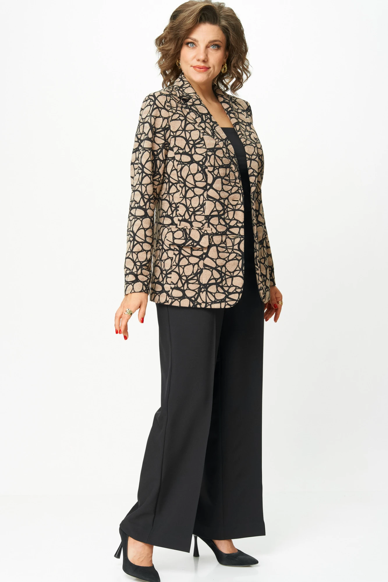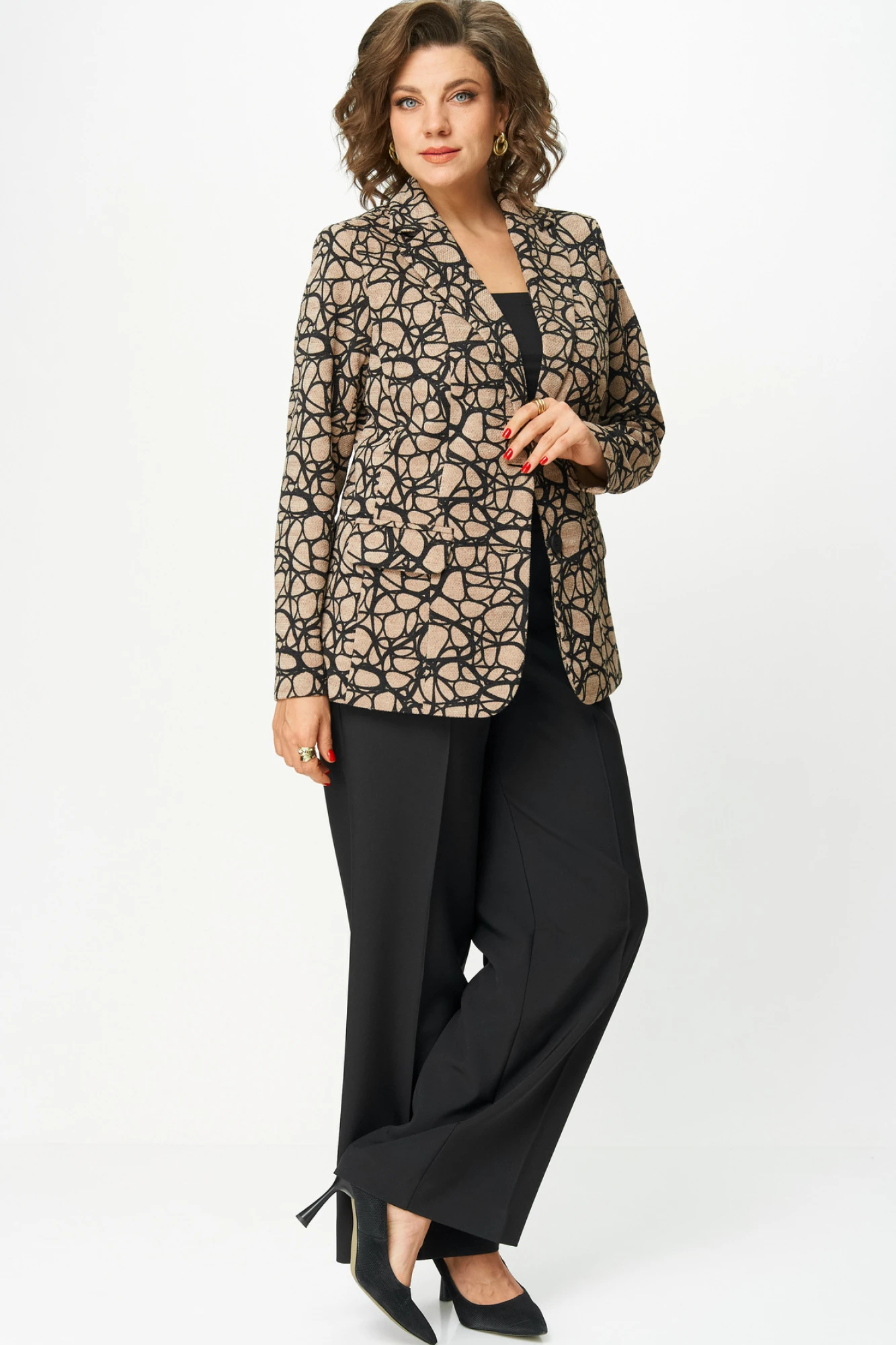 Комплект женский-двойка, из текстильной ткани, жакет женский удлиненный, из трикотажной ткани, перед жакета на подкладке, полуприлегающего силуэта с центральной бортовой застежкой на пуговицы до линии перегиба лацкана. Спереди рельефные швы от плечевого шва, отрезной бочок и карман с клапаном. Спинка с рельефами от плечевого шва. Рукав втачной, двухшовный. Воротник пиджачного типа. Длина по спинке 70, длина рукава 61. Брюки-палаццо,средней ширины,из плотной текстильной ткани, выполнены с карманами с отрезным бочком в боковом шве. Пояс притачной, застёжка на молнию. По задним половинкам обработаны вытачки. Длина по боковому шву 108 см.
