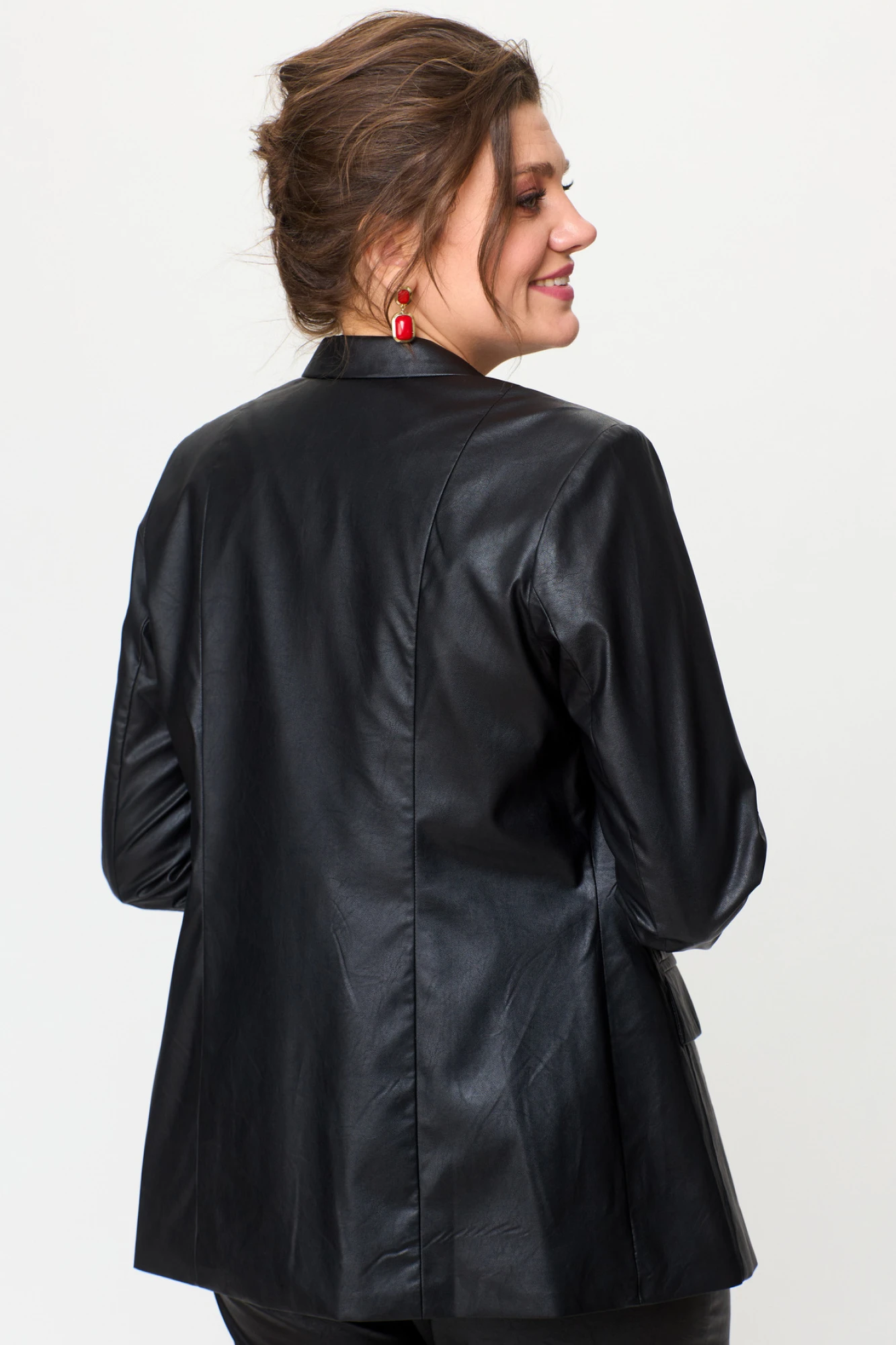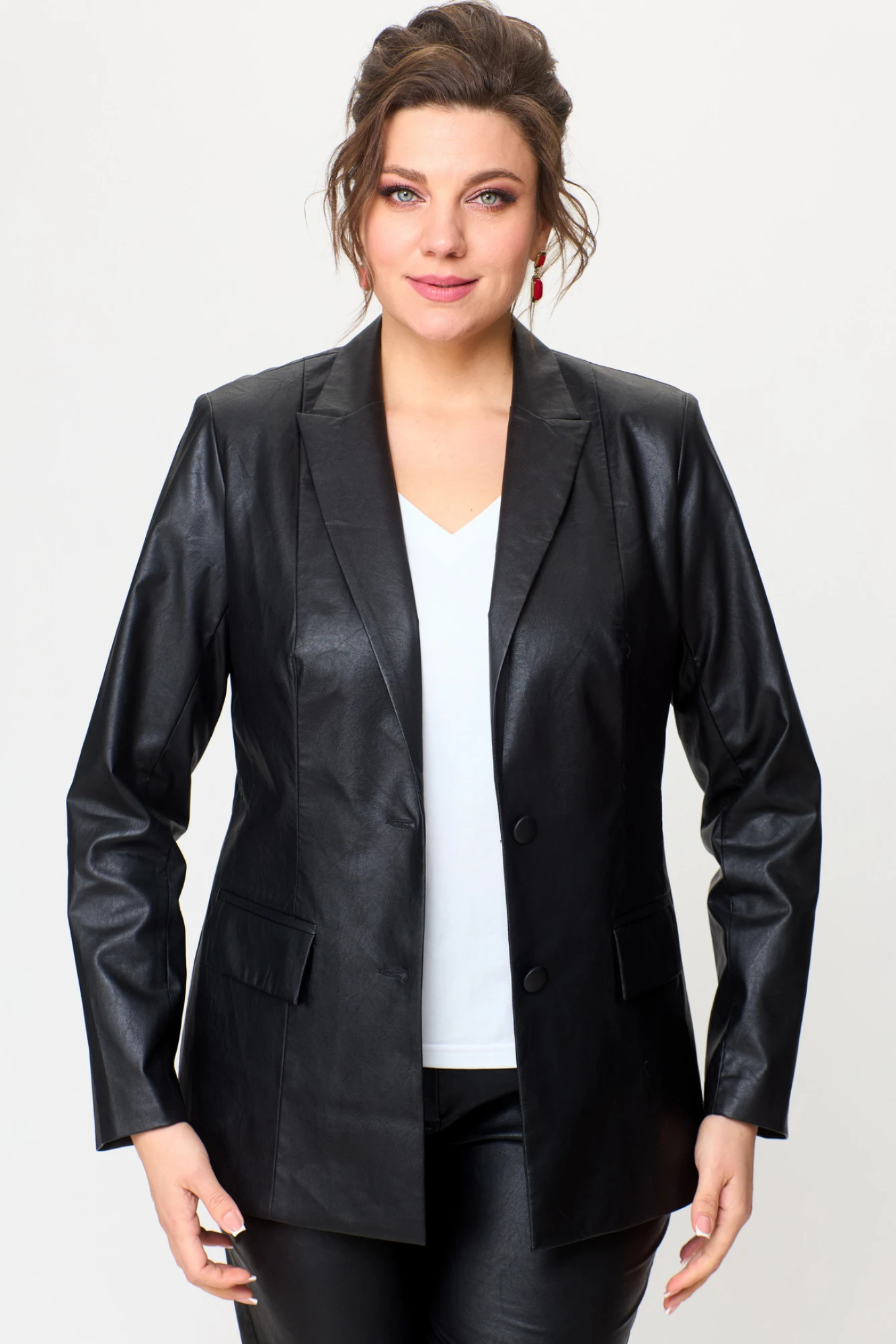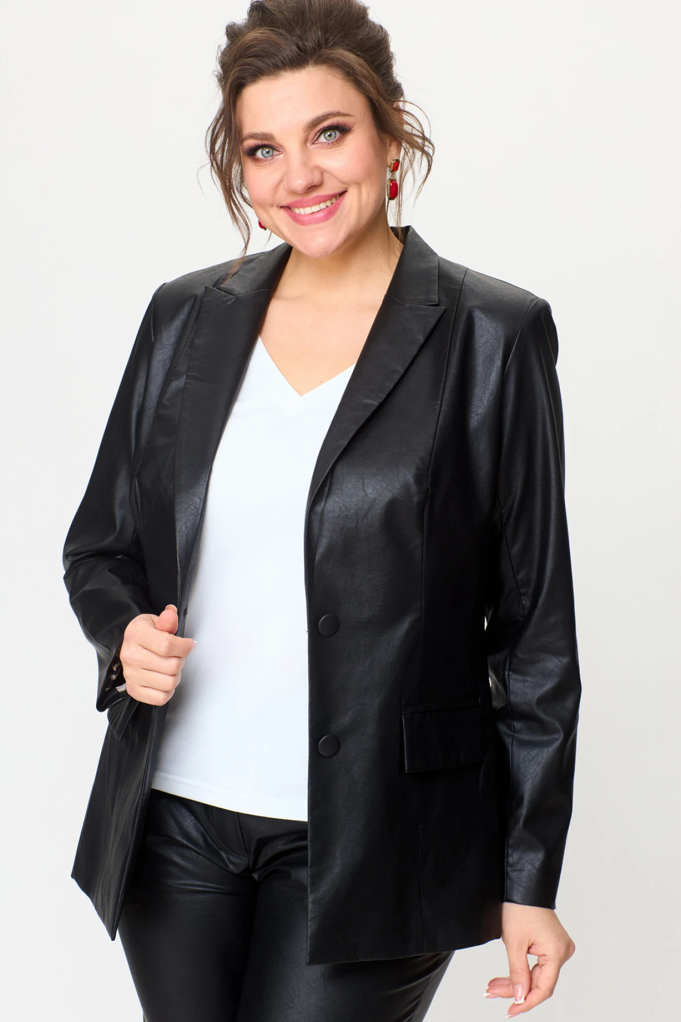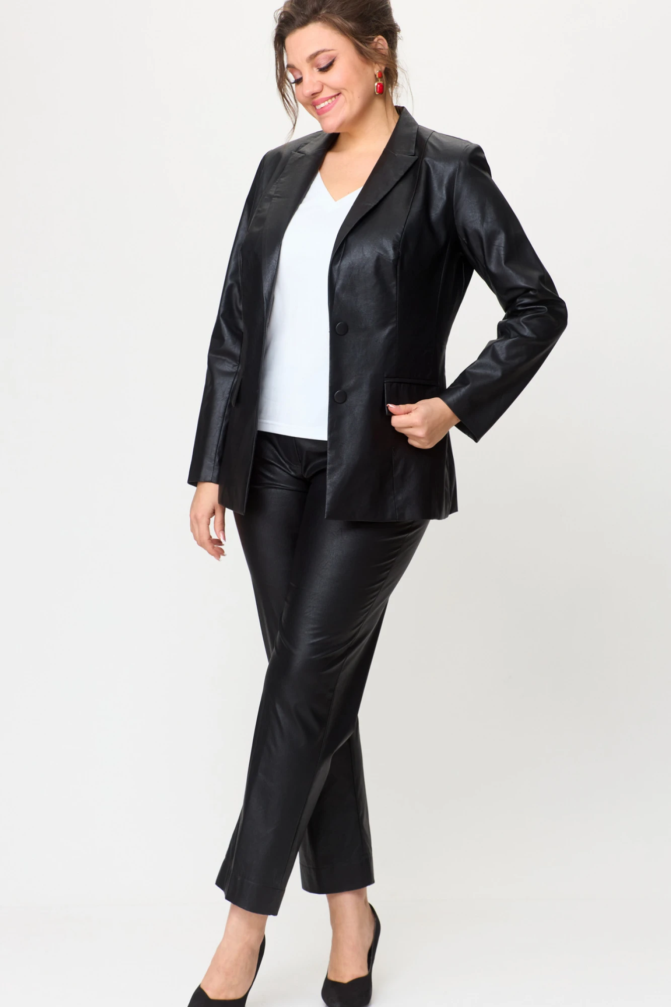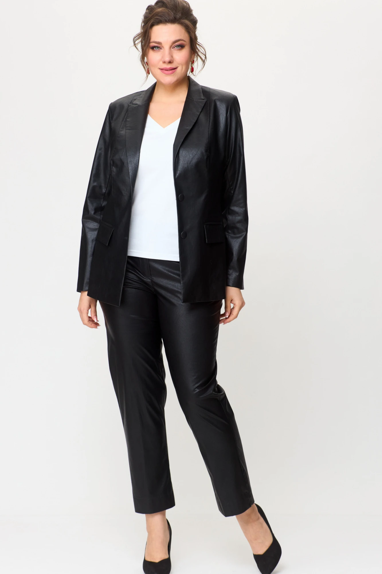 Это не просто две вещи — это готовый идеальный образ. Комплект из удлиненного жакета и классических брюк из эко-кожи создан для тех, кто ценит безупречный крой, актуальные тренды и выразительную лаконичность. Жакет полуприлегающего силуэта с центральной бортовой застежкой на пуговицы до линии перегиба лацкана. Спереди рельефные швы от плечевого шва,отрезной бочок и карман с клапаном. Спинка с рельефами от плечевого шва. Рукав втачной, двухшовный. Воротник пиджачного типа. Жакет полностью на подкладке. Брюки прямые, слегка заужены к низу,заутюжены стрелки,по переду обработаны карманы с отрезным бочком,застежка на тесьму-молнию и 1 пуговицу.На задних половинках обработаны вытачки и имитация карманов с листочкой, пояс в брюках притачной. Длина жакета по спинке 67 см, длина рукава 62 см, длина брюк по боковому 94 см.