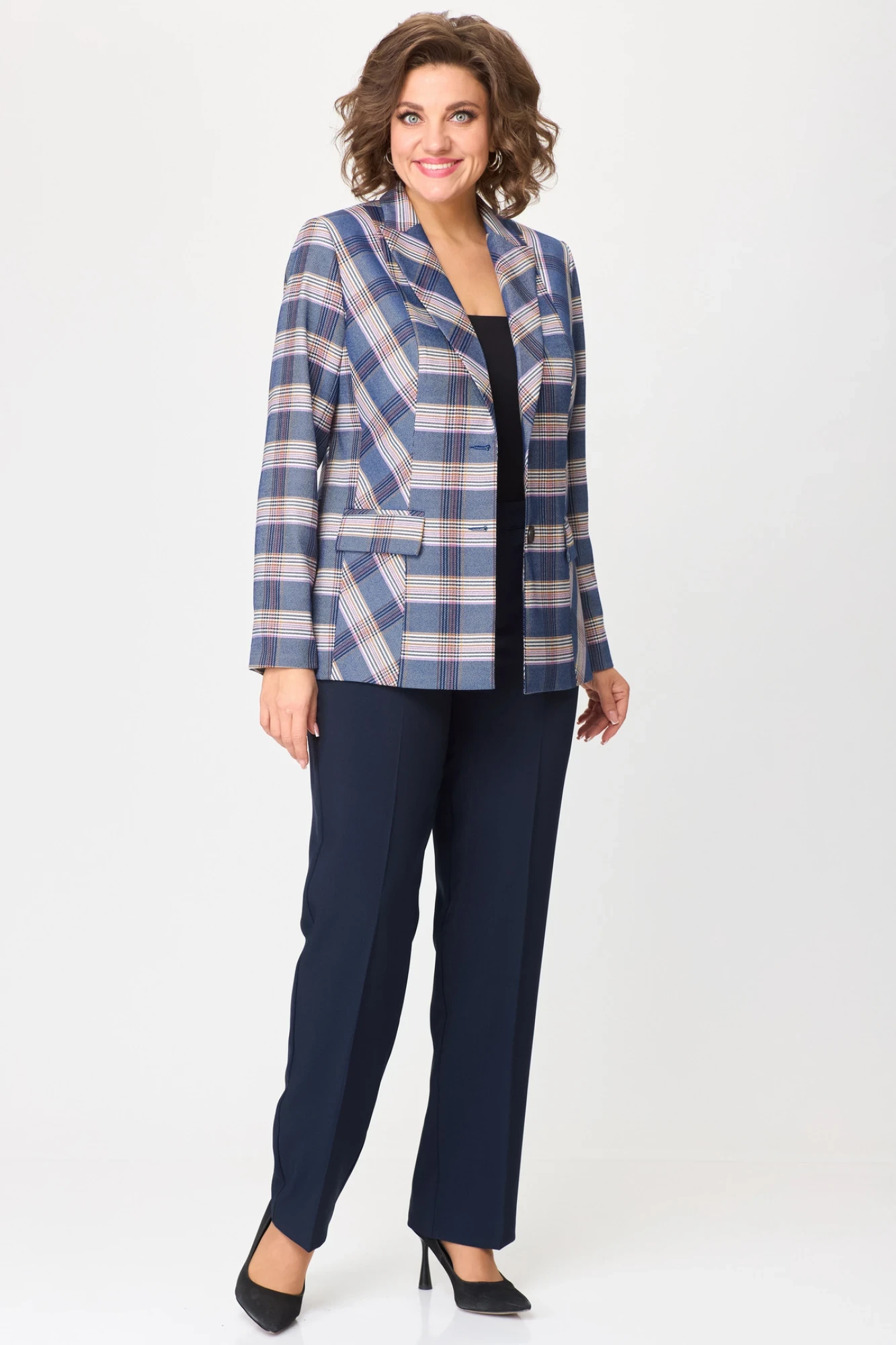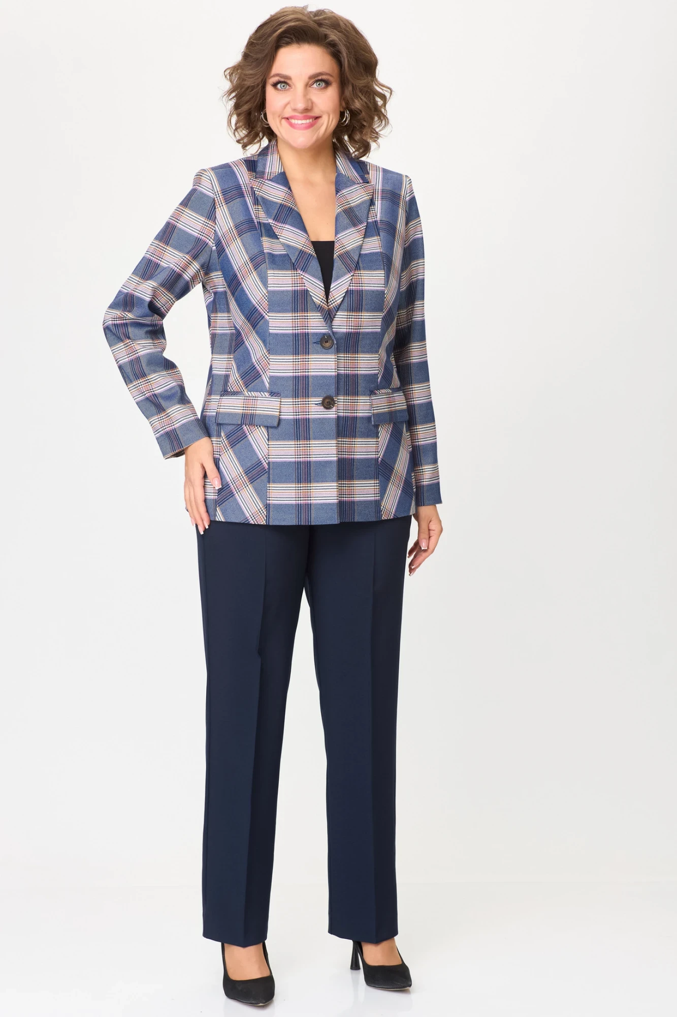 Брючный костюм БелЭльСтиль 412+596 бело-синяя клетка + синий однотон