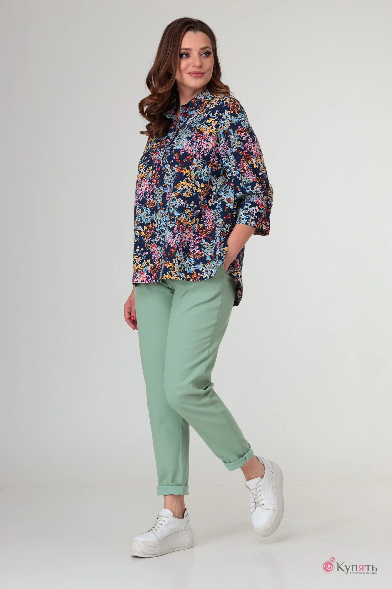 Оригинальный стильный комплект, состоящий из рубашки в стиле оверсайз и брюк. Эффектная рубашка выполнена из легкой и комфортной ткани: вискоза 100%. Необычный покрой модели создаёт модный и свежий образ. Силуэт свободный, прямой, слегка расширен к низу. По переду притачная планка с застежкой на петли-пуговицы и воротник рубашечного типа с отрезной стойкой. Спинка цельная с отрезной кокеткой вверху. Боковые швы изделия обработаны притачной бейкой с застёжкой на петли-пуговицы. Низ фигурной формы, слегка асимметричен: спинка чуть длиннее переда, также обработан бейкой. Рукав с углубленной проймой и со спущенным окатом, по низу рукава заложены неглубокие складочки и притачная манжета с застежкой на петли-пуговицы. Брюки свободного силуэта, слегка заужены к низу, пояс притачной с эластичной тесьмой-резинкой, от боковых швов расположены внутренние карманы, внизу отложной манжет. Брюки выполнены из качественной ткани под джинс с содержанием эластана. Универсальный и очень актуальный комплект многогранен в своём использовании, отлично впишется во множество стилей и сетов.
