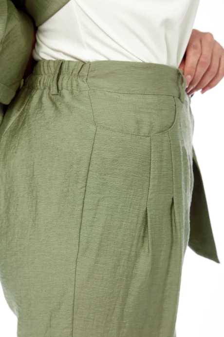 Комплект брючный состоит их жакета, трикотажной майки и брюк. Жакет свободного кроя с застежкой на петлю и пуговицу. Рукава-реглан. Воротник пиджачного типа с лацканами. Рукав боковой с "листочкой". Майка с цельнокройным рукаврм и округлой горловиной, украшена печатью. Брюки зауженные к низу с застежкой "молния" спереди. Задние половинки с талиевыми вытачками . Передние половинки брюк со складками и имитацией кармана. Пояс сзади на резинке.