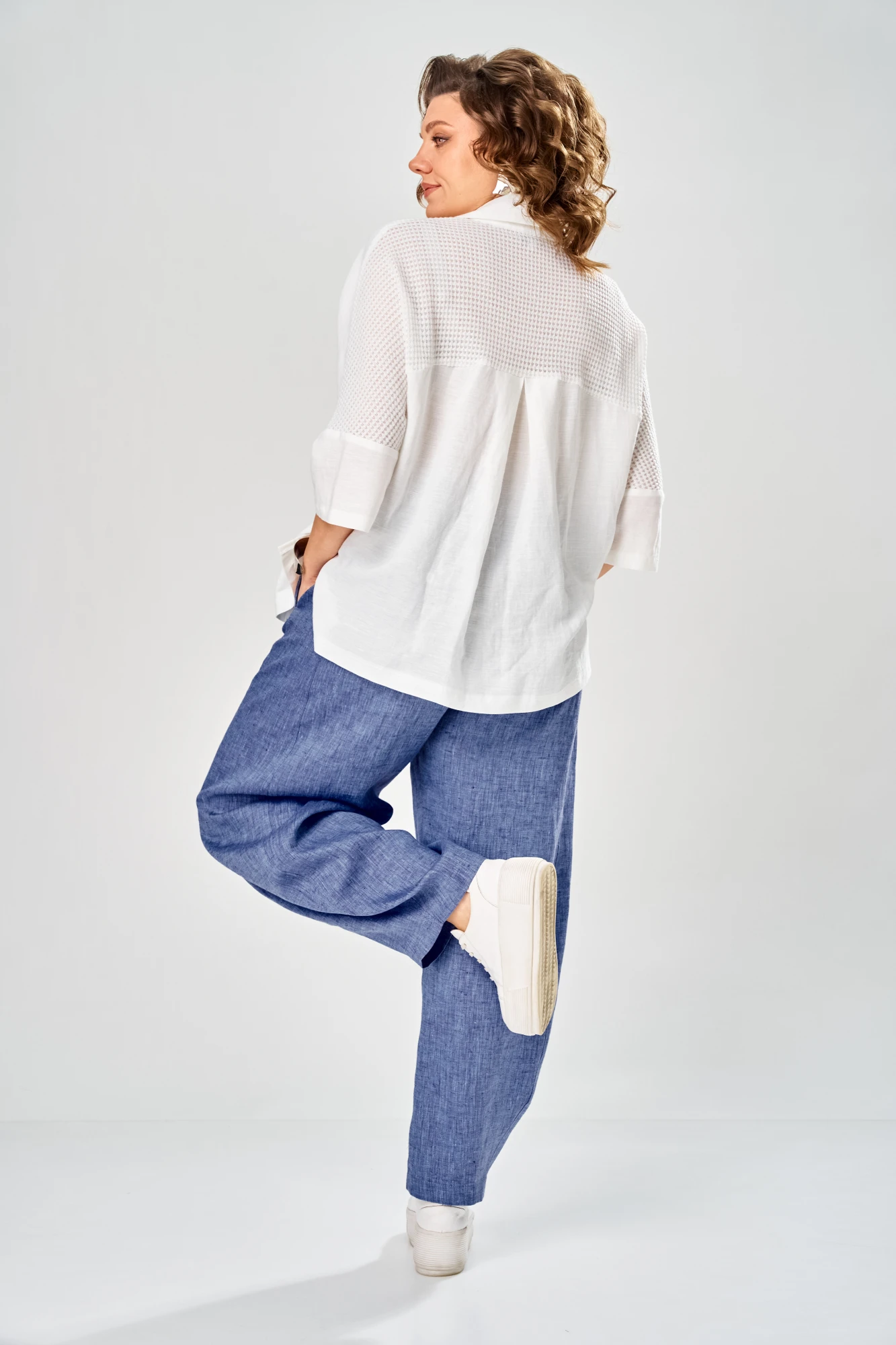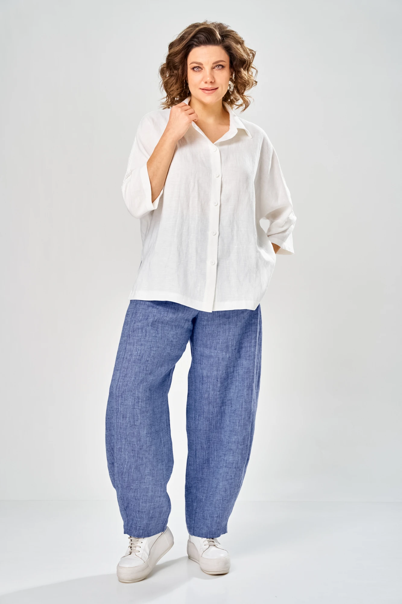 Комплект брючный состоит из рубашки и брюк. Рубашка со спущенным плечом, с застежкой на петли и пуговицы. По спинке кокетка, по шву притачивания нижней части заложена складка, по боковым швам-разрезы. Рукав втачной одношовный короткий. Воротник стояче-отложной с отрезной стойкой. Используются две ткани. Брюки расширенные к низу. На задней половинке-кокетка, обработаны карманы в шве с застежкой на петлю-пуговицу. По переду в рельефном шве бочка обработаны карманы. Застежка на тесьму-молнию, петлю-пуговицу. Верхний срез обработан поясом с резинкой. По поясу-шлёвки. В качестве отделки используется фурнитура, отделочная строчка.