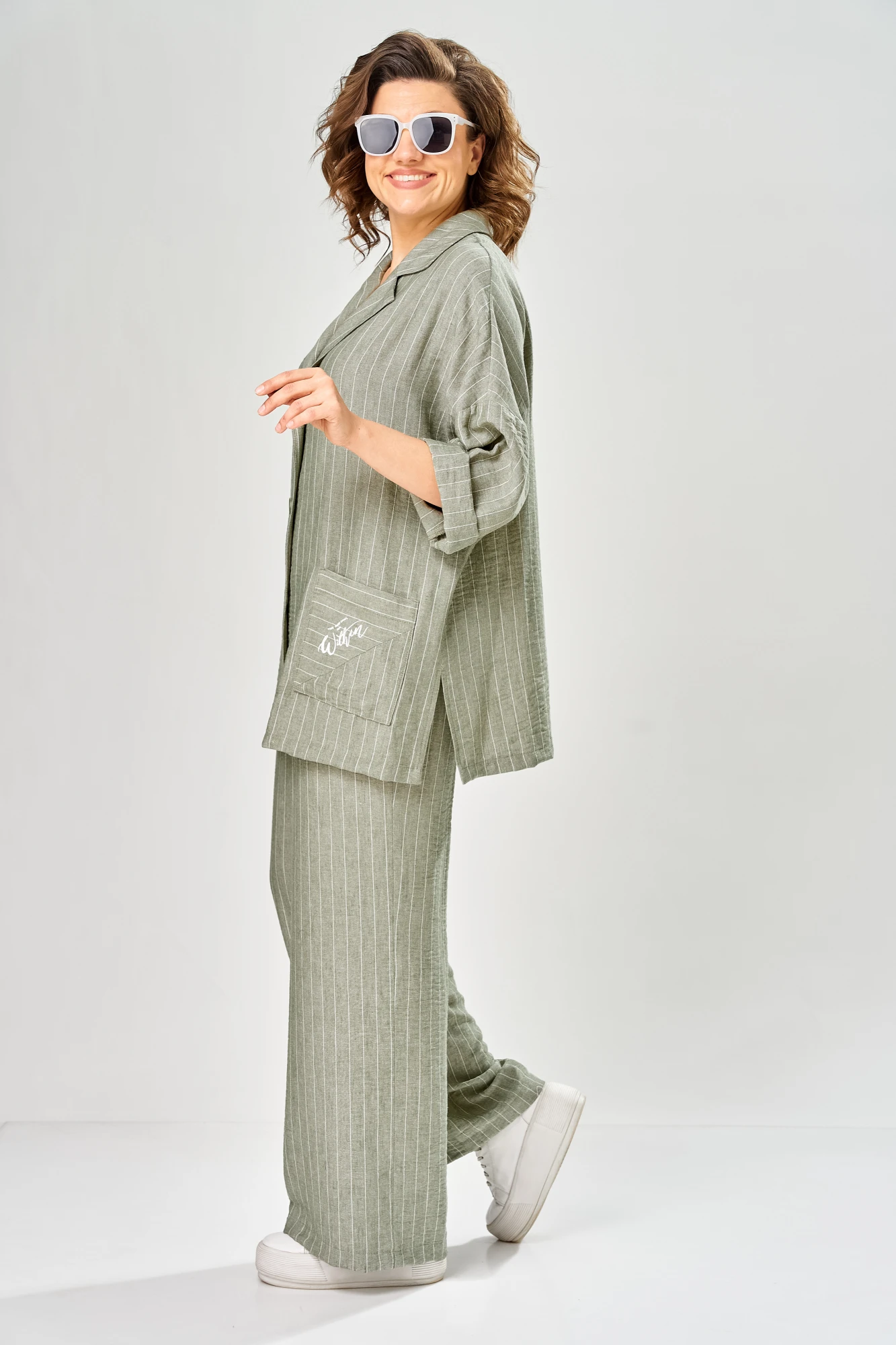 Комплект женский состоит из брюк и жакета. Брюки прямые, свободного кроя с карманам в боковых швах и поясом на резинке. Жакет прямого кроя с центральной застежкой на 3 петли и пуговицы. Перед с боковыми накладными карманами, левый карман украшен печатью. Воротник отложной с лацканами, правый лацкан украшен печатью. Рукав втачной со спущенной линией плеча. В боковых швах обработаны разрезы.