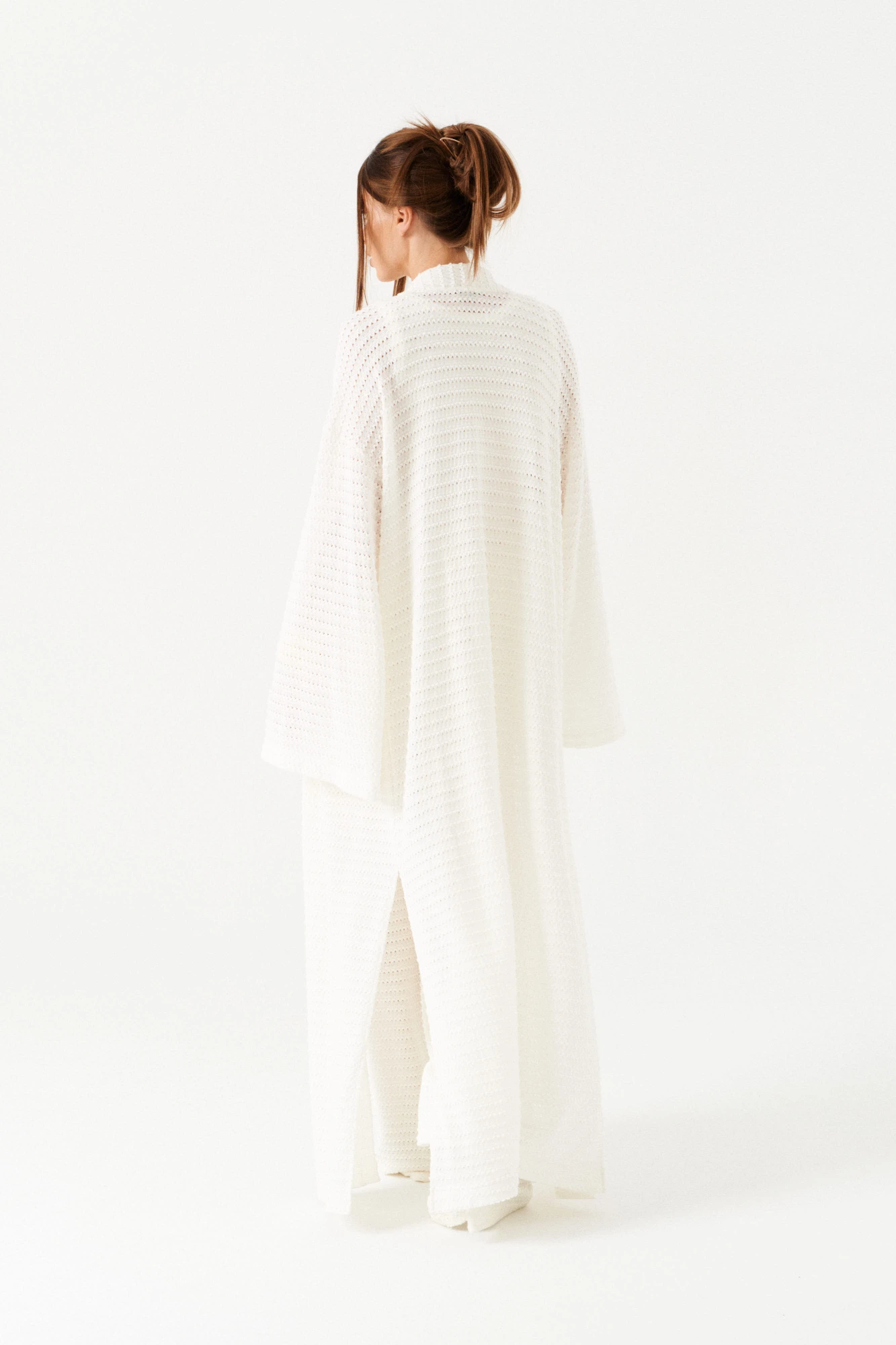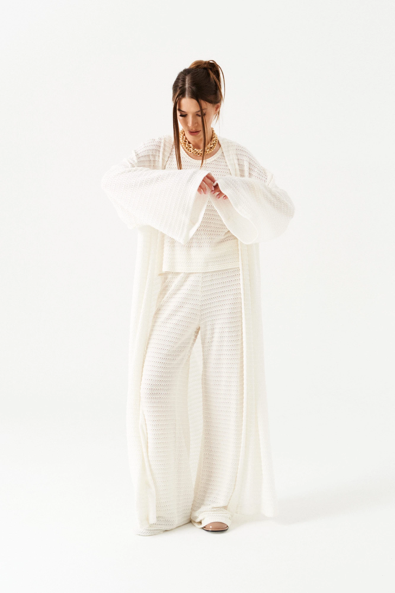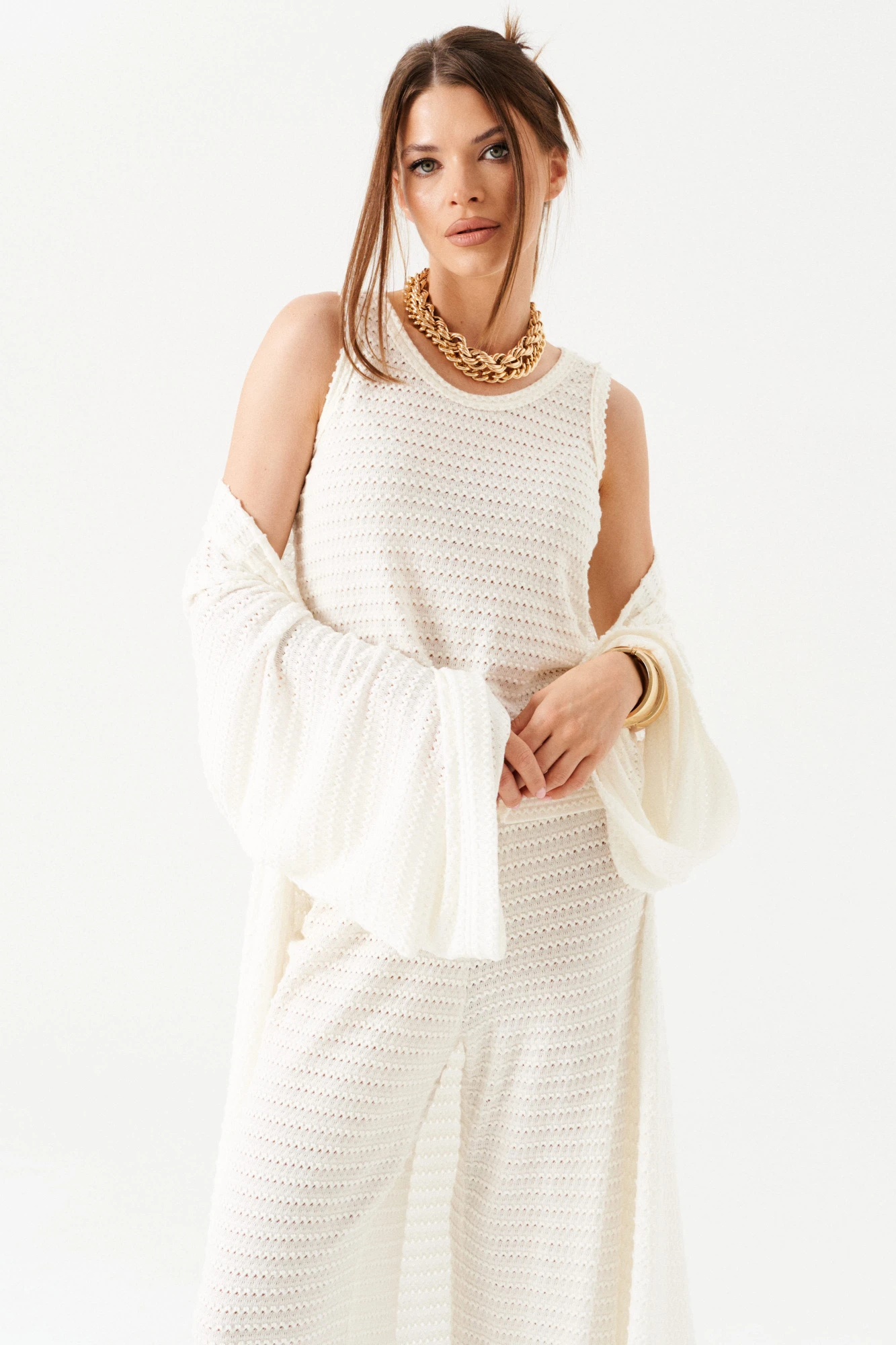 Комплект женский 3-х предметный из трикотажного полотна, состоящий из блузы-топа, брюк и кардигана. Блуза-топ полуприлегающего силуэта. Вырез горловины округлой формы. Горловина и проймы обработаны притачными бейками. Длина блузы-топа до линии бедер. Брюки прямые, широкие, на притачном поясе с резинкой. Кардиган прямой со съемным поясом из основной ткани. Вырез горловины и борта обработаны цельнокроеной планкой. Боковые швы заканчиваются разрезом. Рукав широкий, длинный. Длина – макси.