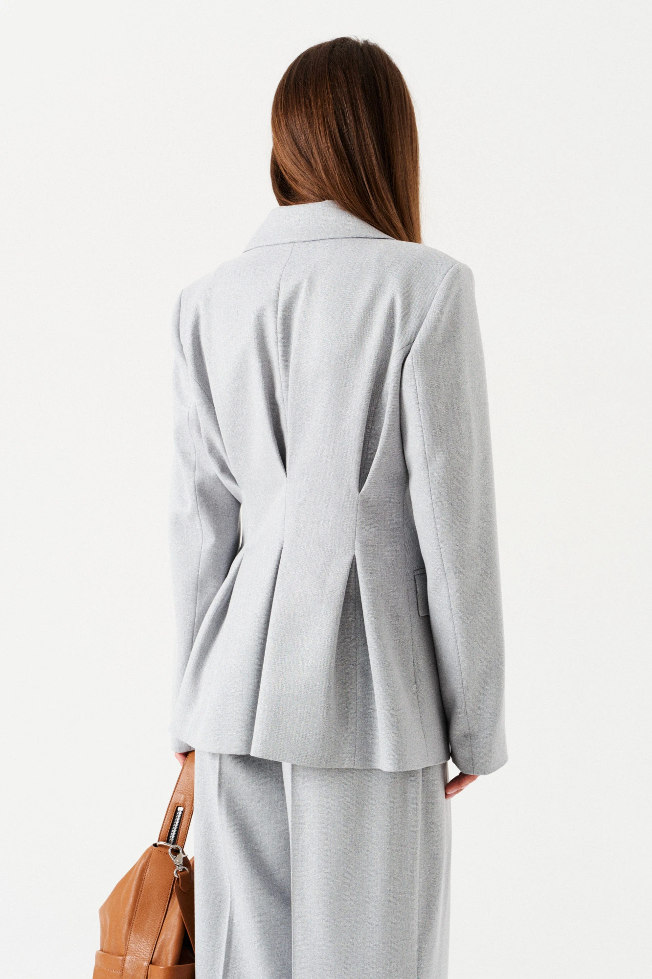 Комплект женский 2-х предметный из костюмной ткани, состоящий из жакета и брюк. Жакет полуприлегающего силуэта, на подкладке, с центральной двубортной застежкой на петли и пуговицы, отложным воротником и лацканами пиджачного типа. По переду – прорезные карманы с клапанами и двумя обтачками, талиевые вытачки, переходящие в встречную складку. Спинка со средним швом, рельефами, выходящими из проймы. На уровне линии талии заложены встречные складки. Рукав двухшовный, длинный. Брюки-палаццо, прямые, со смещенной застежкой. На передних половинках заложены по 2 складки, боковые карманы с отрезным бочком. Застежка брюк – гульфик на молнии. На задних половинках талиевые вытачки. Пояс притачной, со шлевками и частично с резинкой, застегивается на 2 петли и 2 пуговицы.