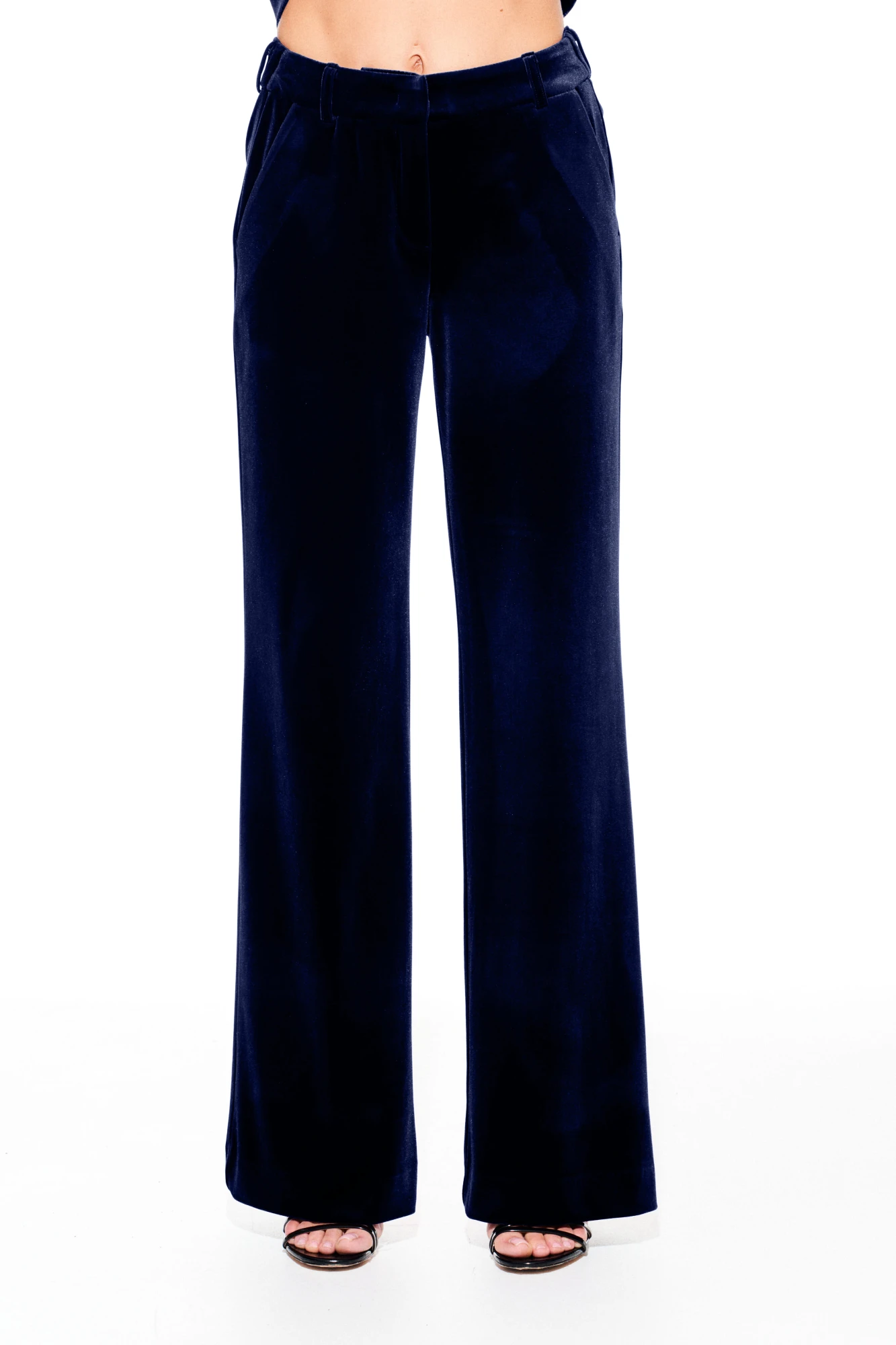 Костюм из бархата на трикотажной основе, 2-х предметный, состоящий из жакета и брюк. Жакет умеренного объема, приталенного силуэта, однобортный, с центральной застежкой на 1 петлю и 1 пуговицу, отложным воротником и лацканами пиджачного типа, на подкладке. Детали переда с талиевыми вытачками и прорезными карманами с клапаном и двумя обтачками. Спинка со средним швом и талиевыми вытачками. Брюки умеренного объема, прямого силуэта. На передних половинках выполнены боковые карманы с отрезным бочком. Задние половинки с талиевыми вытачками. Застежка – гульфик на молнии. Пояс притачной, с резинкой по спинке, шлевками, застежкой на крючок и потайную пуговицу.