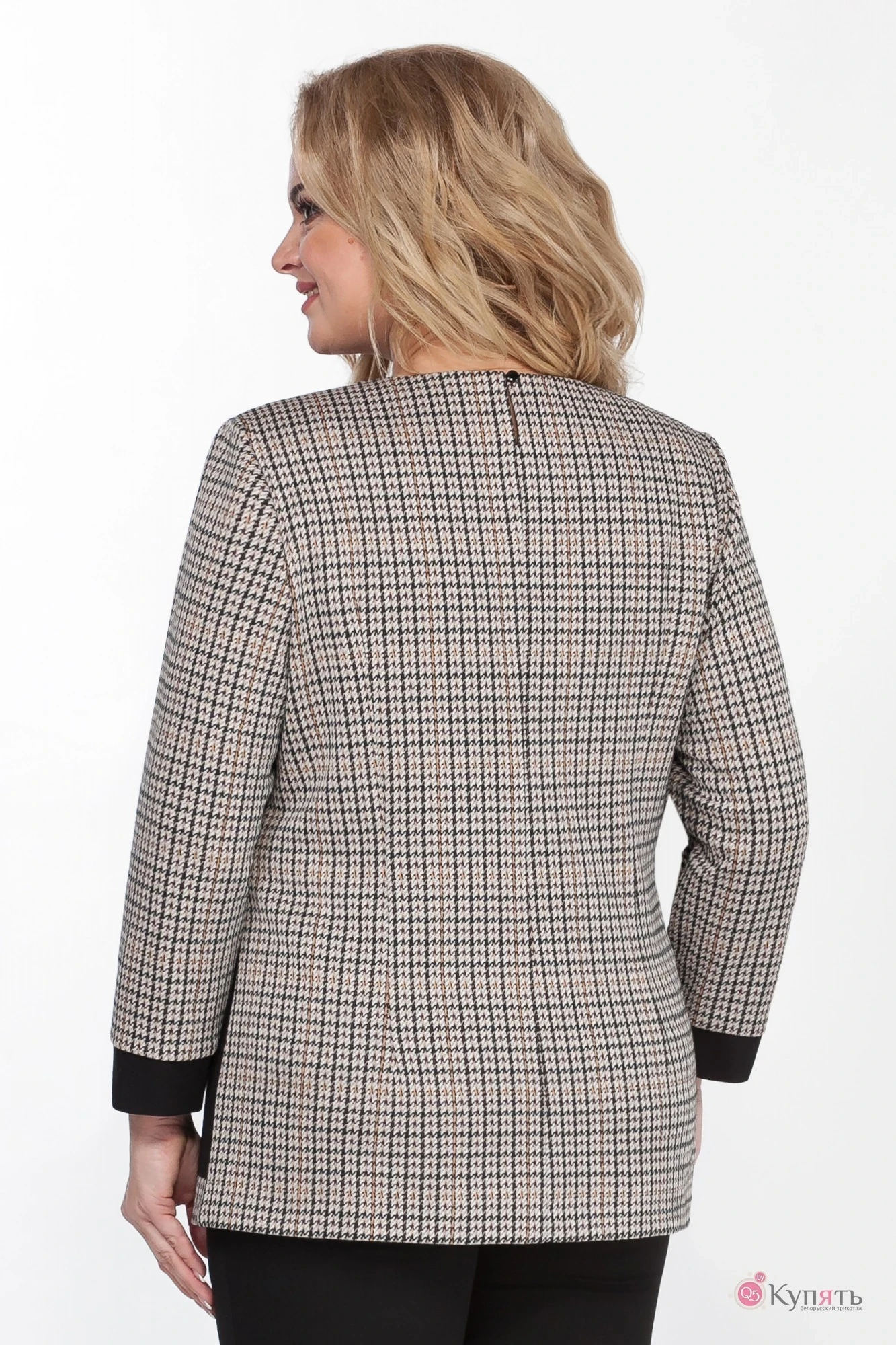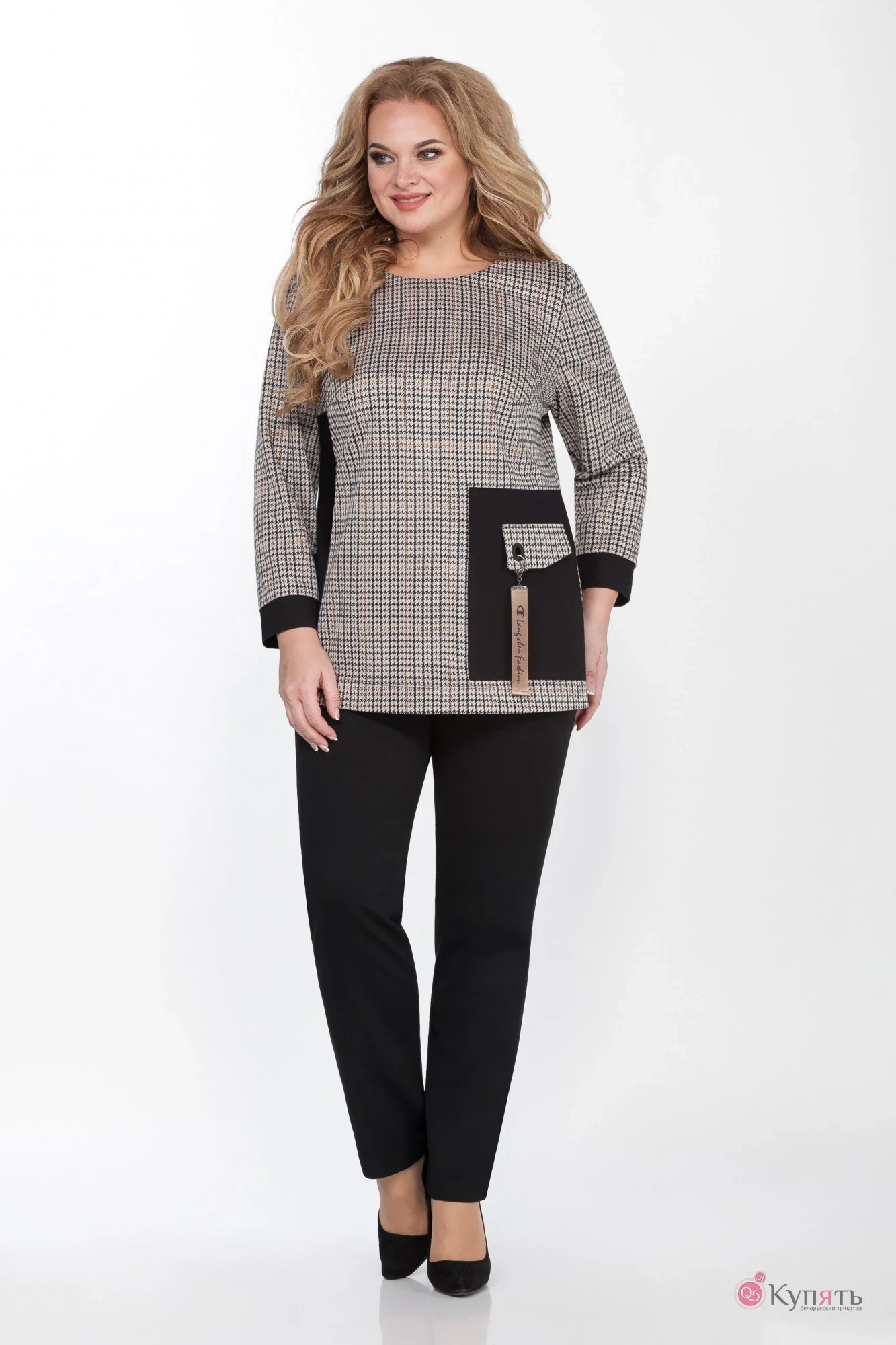 Комплект 2-ух предметный, состоит из блузки и брюк.Очень удобная, практичная блуза из принтованного трикотажного полотна полуприлегающего силуэта. На полочке нагрудные вытачки, вставки из однотонной ткани. Декоративным элементом является фигурный клапан с моверсом и брелком карабином. Горловина обтачная круглая. По спинке талиевые вытачки, застежка по среднему шву на 1 петлю, пуговицу. Рукав втачной, обработан манжетой из отделочной ткани.Брюки слегка зауженные к низу. Пояс притачной. Застежка тесьма-молния, петля и пуговица.