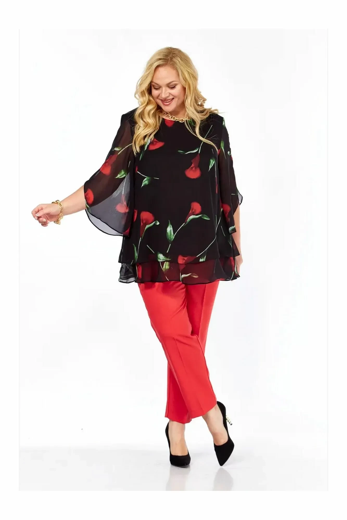 Блузка – полиэстер 100% (шифон). Брюки – полиэстер 50%, вискоза 50%