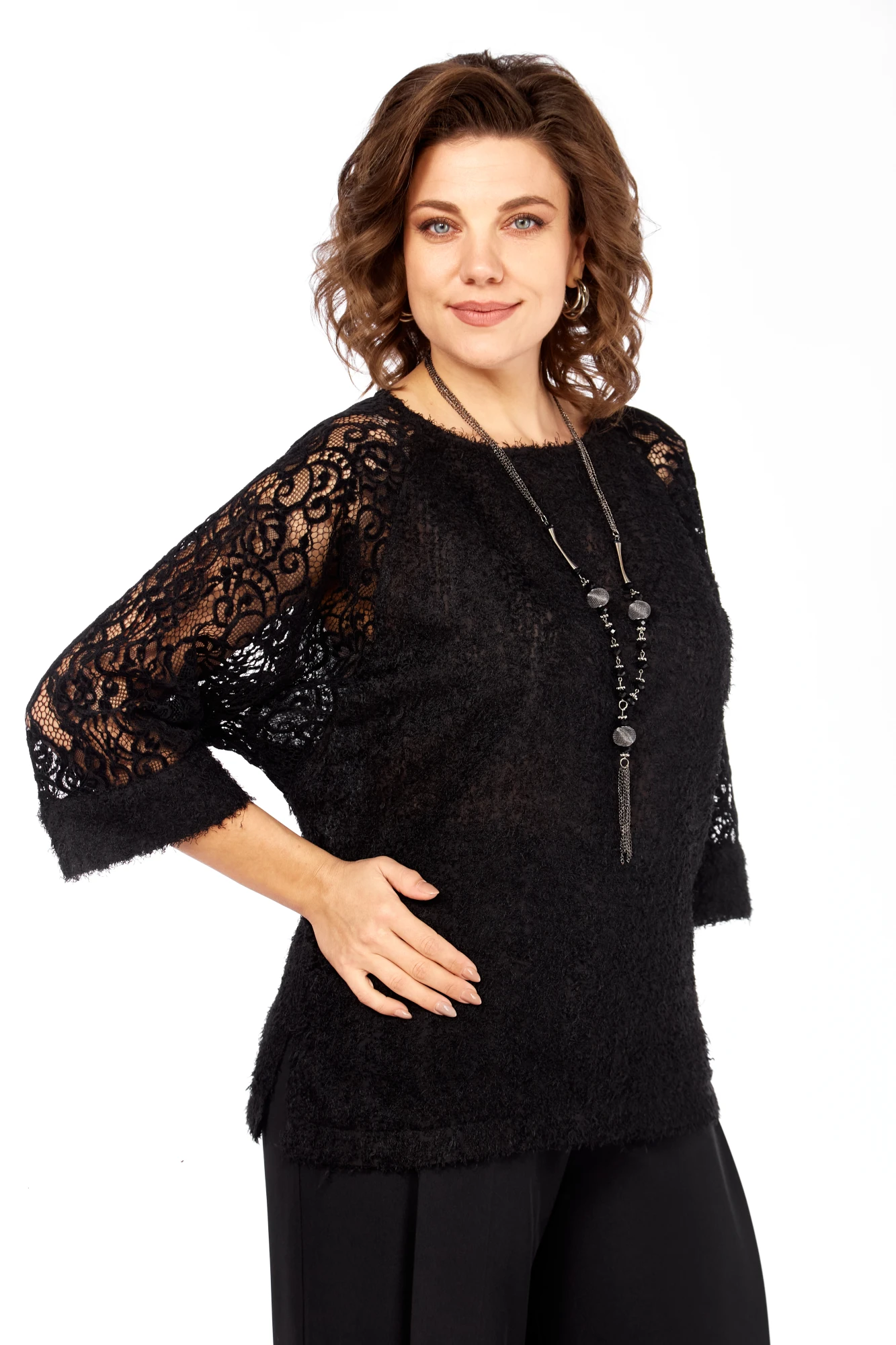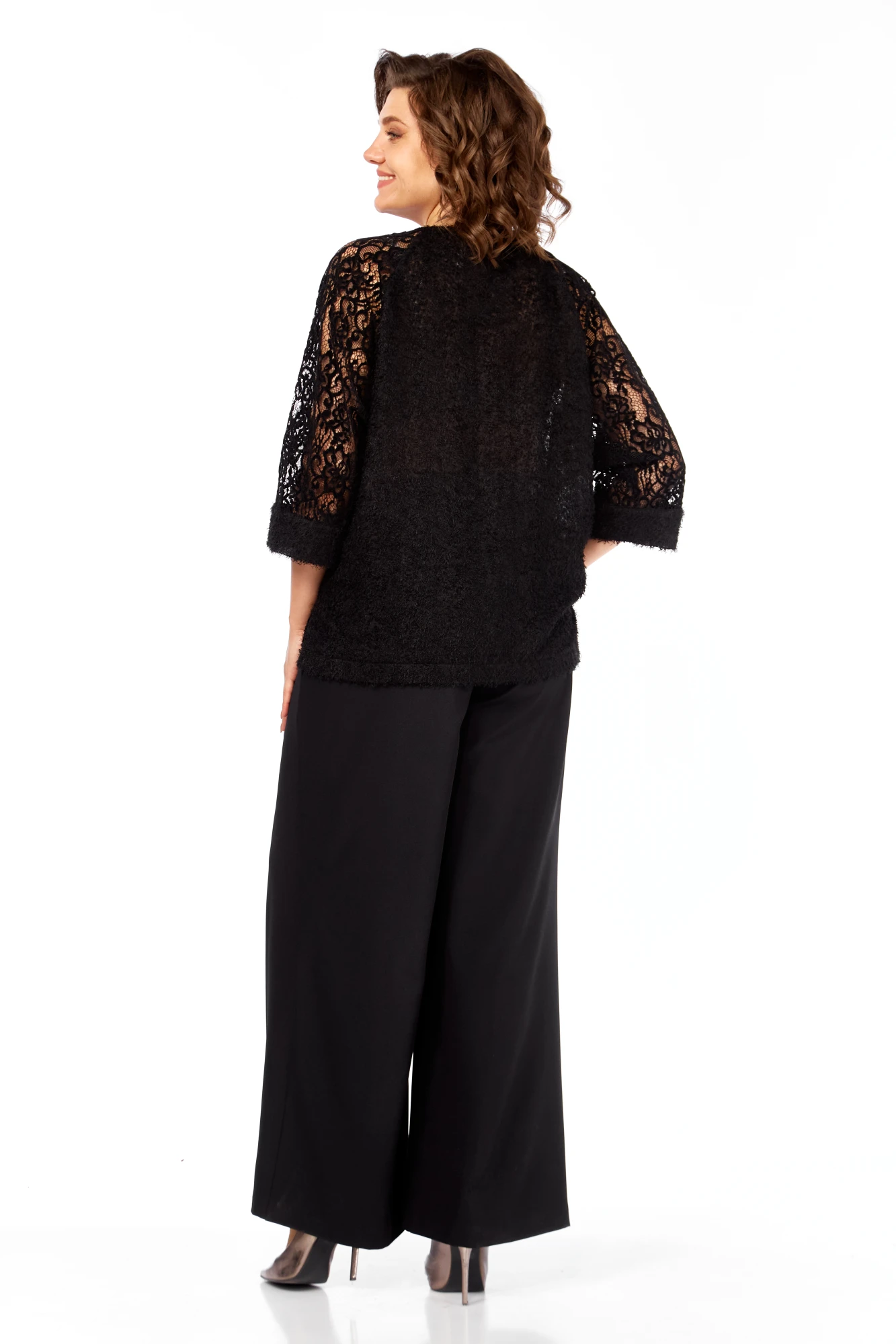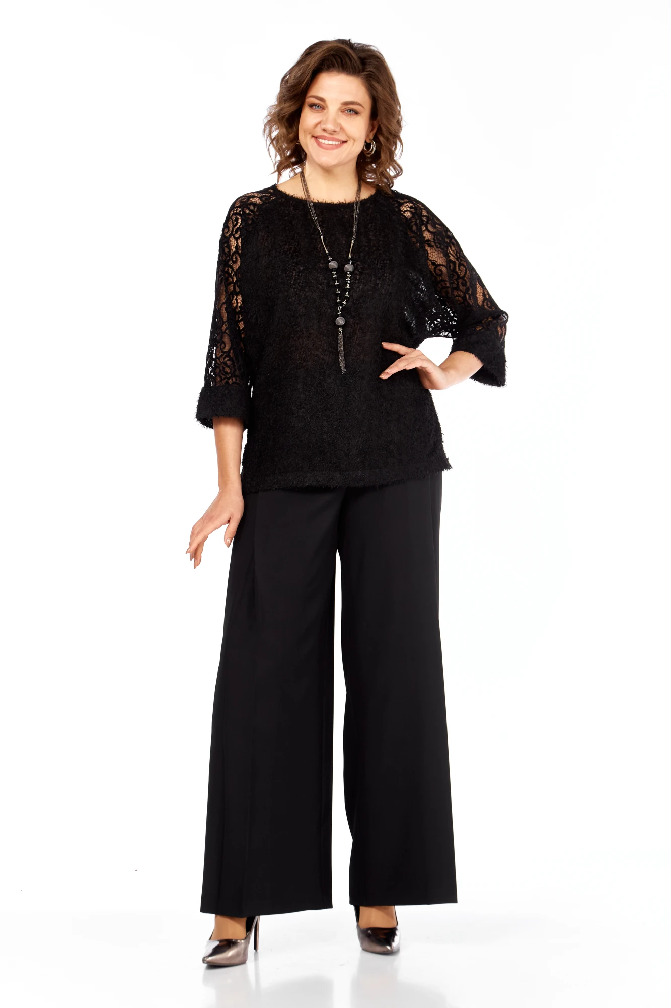 Комплект женский брючный 2-х предметный. Праздничная элегантная блузка полуприлегающего силуэта, выглядит эффектно, прекрасно подойдет для вечерних мероприятий. Горловина аккуратной округлой формы. Рукав выполнен из мягкого кружева, что придает дополнительный шарм, длина 7/8. В боковых швах предусмотрены разрезы. Невероятно комфортные, элегантные брюки-палаццо, образ в котором будет привлекать к себе внимание окружающих. Идеально подходит как для офиса, так и для вечернего выхода. Брюки свободные. По переду заложены складки, в боковых швах расположены боковые карманы, застежка-молния. Пояс притачной, сзади на резинке, это обеспечивает комфортную посадку. Широкий крой палаццо добавляет образу легкость и непринужденность, стрелки визуально удлиняют силуэт