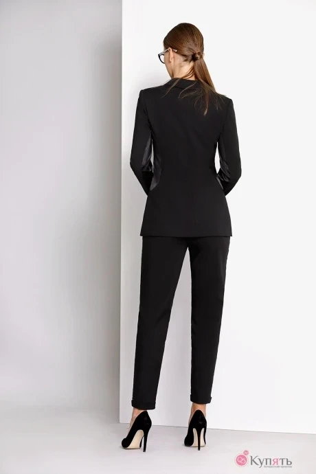 Комплект: жакет, брюки. Комплект выполнен из однотонной костюмной ткани с отделкой из плотного атласа. Жакет двубортный, приталенный, на подкладке, по лацканам воротника, борту и рукавам вставлен декоративный кант с надписью "fashion". Брюки с высокой посадкой заужены книзу, с лампасами из атласа, с карманами по бокам, на задних половинках брюк листочки с кантом, по низу брюк небольшие отвороты.