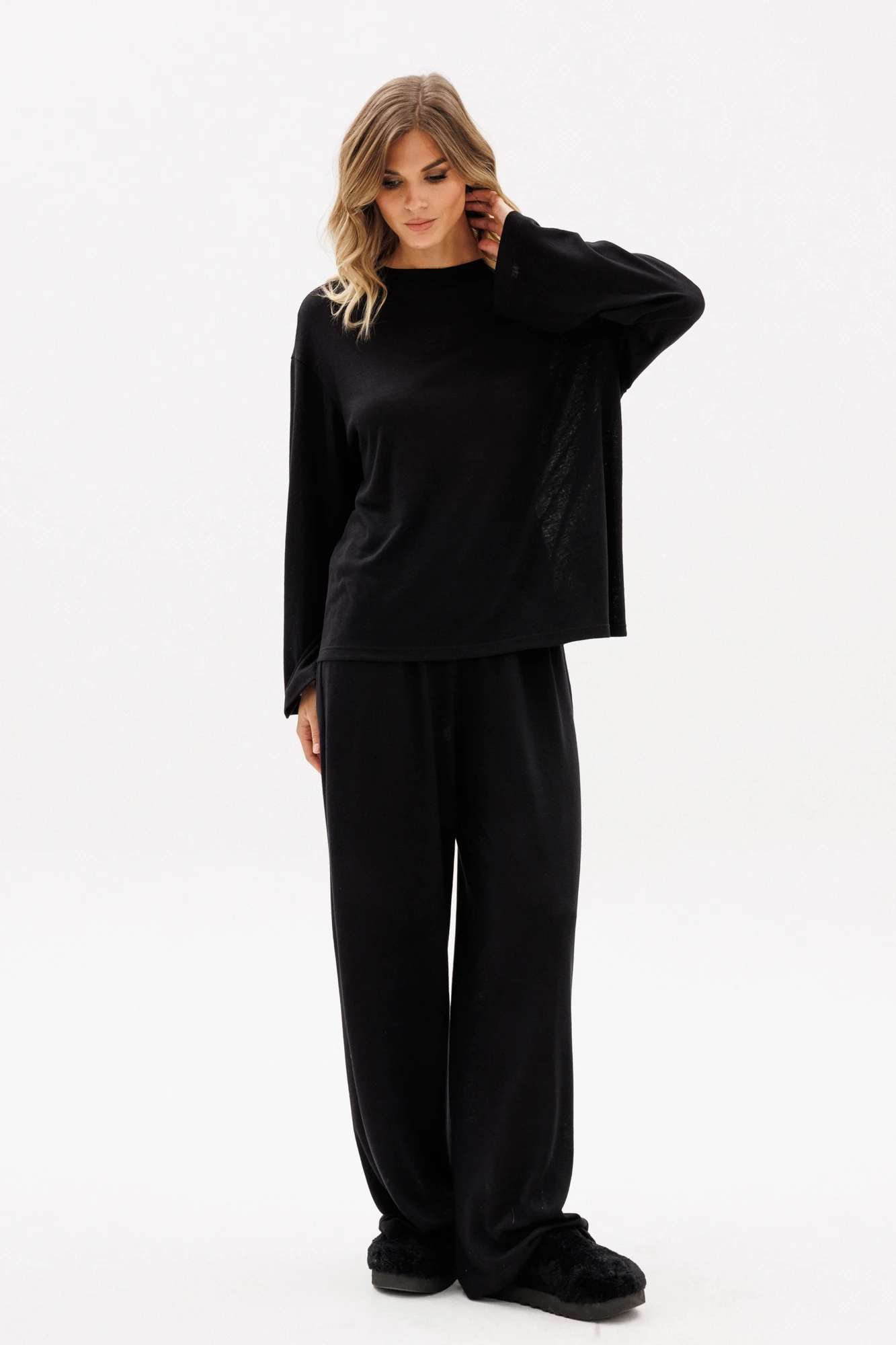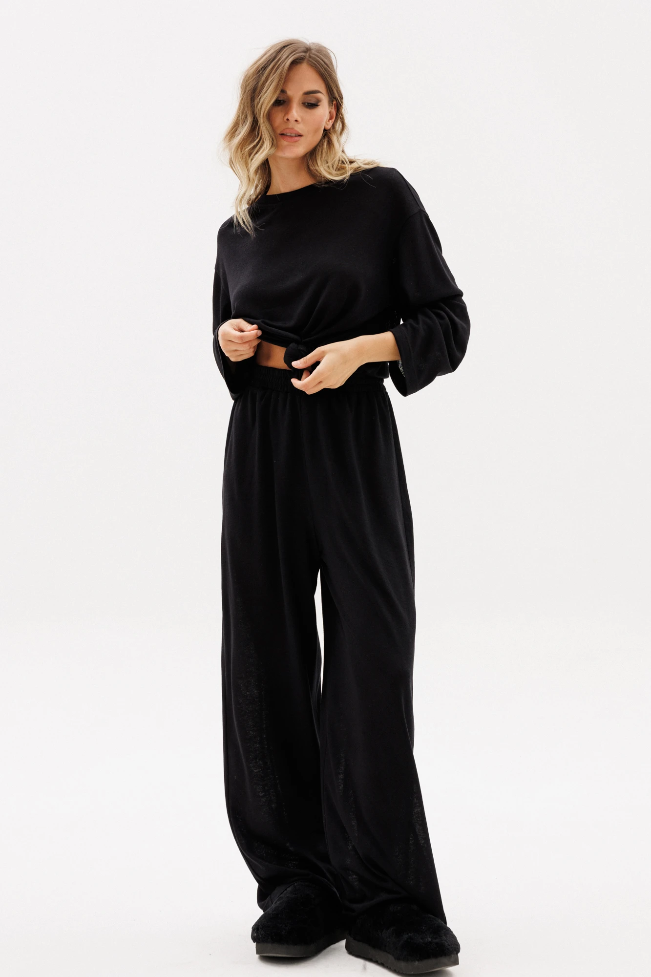 Комплект: джемпер + брюки. Комплект выполнен из трикотажного полотна. Джемпер прямого силуэта, длиной до линии бедра. Перед и спинка цельные. Горловина округлой формы, обработана широкой бейкой. Плечевой шов удлинен. Рукав рубашечного покроя, одношовный. Брюки прямого покроя, длиной в пол, на притачном поясе с эластиной тесьмой.