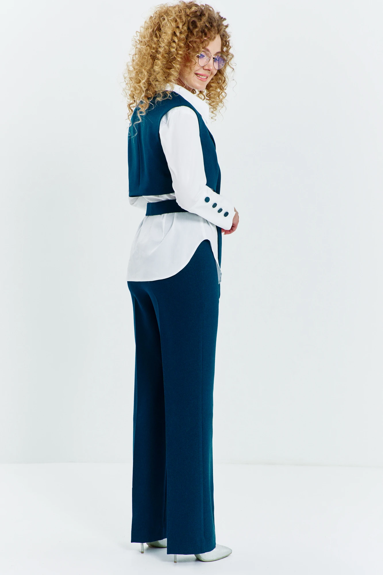 Костюм женский 3х предметный состоит из брюк блузы и жилета, блуза выполнена из хлопковой ткани, полуприлегающего кроя , горловина воротник на стойке, рукав втачной с высокой манжетой по низу рукава, застежка - планка с петлей пуговицей, низ фигурный. Жилет свободного кроя, укороченный, воротник отложной с лацканами, по переду жилета съёмный пояс, с застежкой петли -пуговицы. Брюки средней посадки, прямого кроя на притачном поясе с резинкой, в боковых швах имеются карманы, застежка петля- пуговица и молния на гульфике