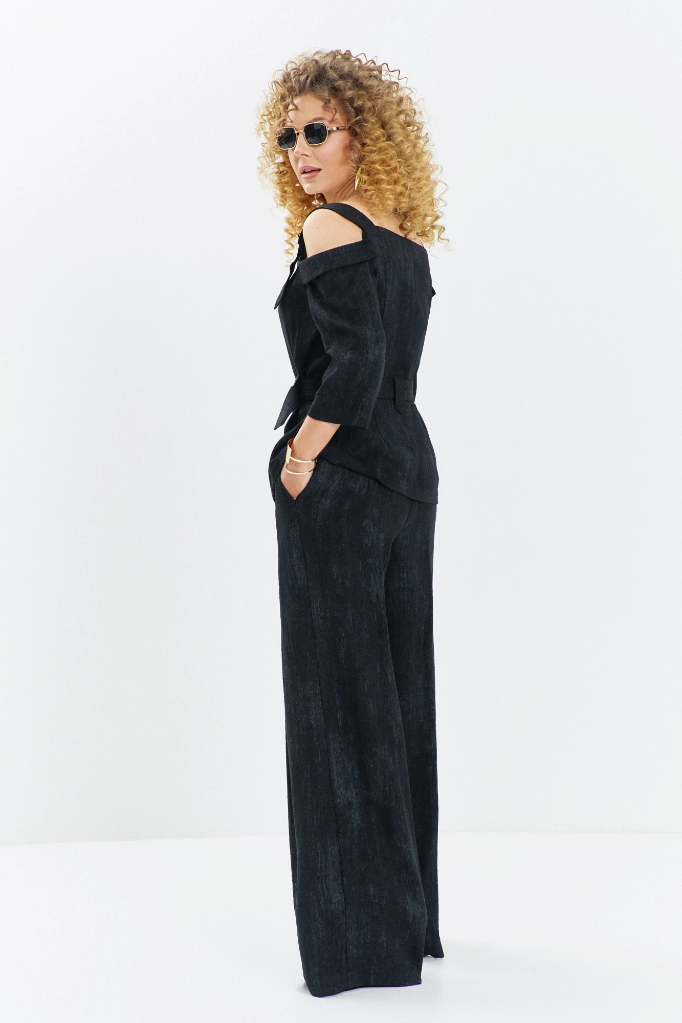 Костюм брючный выполнен из вискозы с стиле Urban Chic. Архитектурный крой блузы с акцентом на плечи. Открытая линия плеч в сочетании с брутальными декоративными ремнями-лямками с пряжками создает интригующий контраст между женственностью и силой. Блузон полуприталленного кроя подчеркнутый широким ремнем с люверсами, формирует идеальный силуэт «песочные часы». Рукава блузона- спущенные. Застежка- кнопки. Роскошные брюки палаццо с высокой посадкой — это ода свободе. Брюки на притачном поясе с резинкой в боковых швах и засежкой- молния на гульфике. В боковых швах брюк имеются карманы с отрезным бочком. Свободный крой от бедра визуально бесконечно удлиняет ноги и создает летящую походку. Ткань: Фактурное полотно с эффектом «меланж» или «вареного денима»