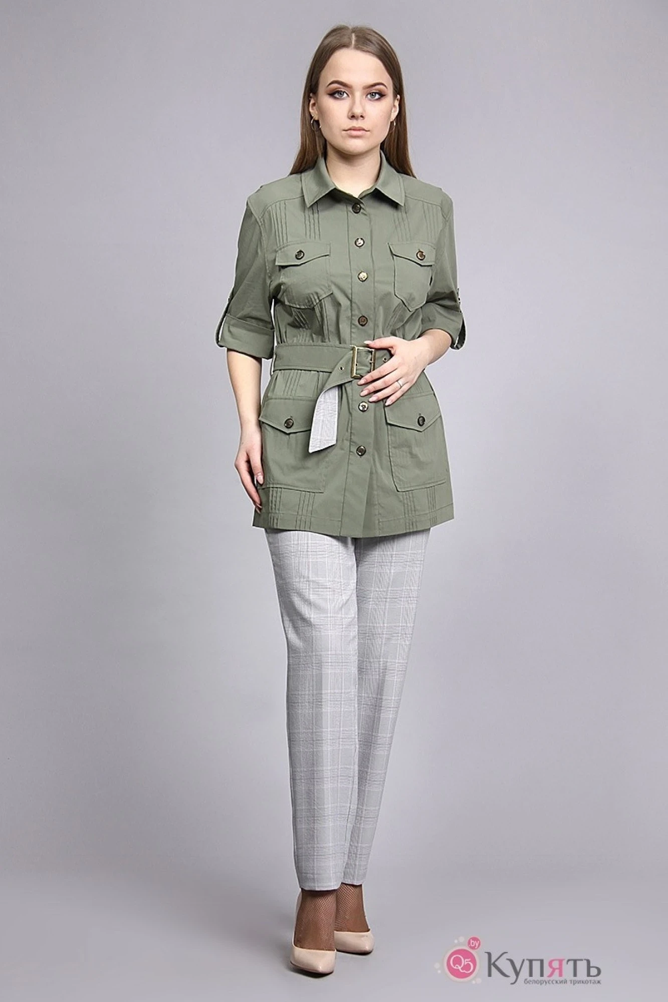 Комплект из однотонной блузы и брюк в клетку. Упрямлённая блуза рубашечного типа со слегка спущенным рукавом. По переду и спинке вертикальные защипы, по переду накладные карманы с клапанами. Съёмный пояс с металлической пряжкой подчеркнёт линию талии. Брюки на притачном поясе с боковыми карманами, зауженные к низу, выполненные из ткани в клетку.
