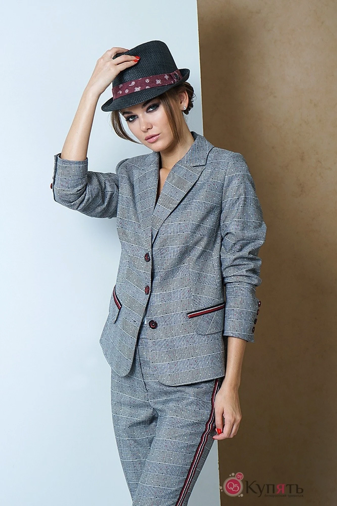 ВНИМАНИЕ!!! Лампасы и пуговицы как на доп.фото. Стильный брючный комплект из ткани в клетку. Удлинённый жакет полуприлегающего силуэта с воротником пиджачного типа и центральной бортовой застёжкой на три пуговицы. По переду вытачки, вертикальные рельефы и прорезные карманы с клапанами. Форма клапанов и низ борта закруглённой формы. Рукава втачные двухшовные со шлицами по низу.Декоративные элементы контрастная тесьма по линии клапанов и боковым швам брюк, отделочные пуговицы. Жакет на подкладке. Брюки на притачном поясе с наклонными боковыми карманами, зауженные к линии низа.