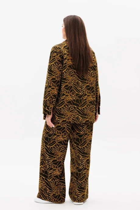 Прежде всего, его выделяет роскошная ткань с геометрическим крупным рисунком, которая позволяет создать такой великолепный вариант брючного комплекта, который составит конкуренцию любому платью.