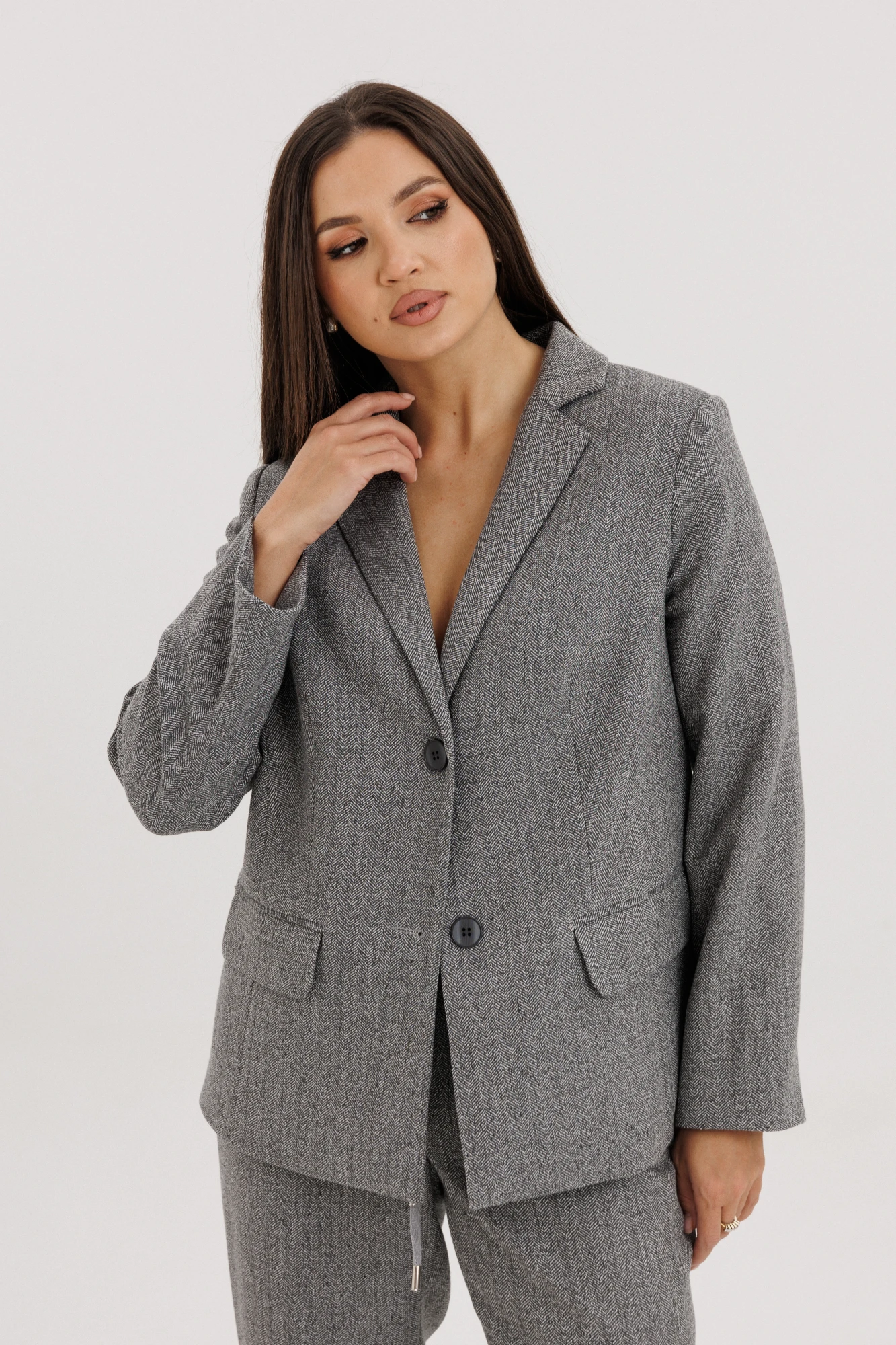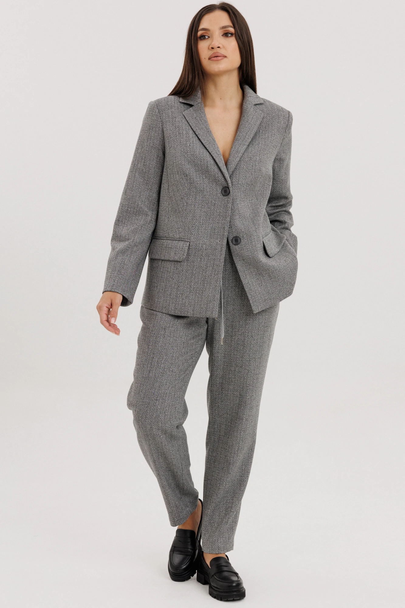 Силуэт свободный, слегка упрямлённый, покрой-втачной, воротник классический английский, линия борта фигурная, застёжка на две петли и пуговицы. Полочка с отрезным бочком, нагрудной вытачкой и прорезным карманом с клапаном. Спинка со средним швом и талиевой вытачкой. Рукав двухшовный с отлетной шлицей и отделочными пуговицами. Брюки свободные, на эластичном поясе с люверсами и отделочным шнуром. Передние половинки с боковыми накладными карманами. Длина пиджака около 67 см, длина рукава около 60 см. Длина брюк около 98 см"