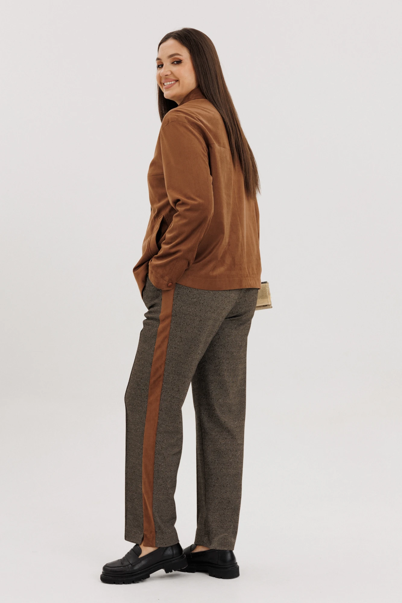 Стильный женский брючный костюм в стиле смарт-кэжуал сочетает комфорт и элегантность. Рубашка выполнена из замшевой ткани, брюки из трикотажа с декоративными замшевыми вставками. Идеальный выбор для офиса, деловых встреч и повседневных образов.