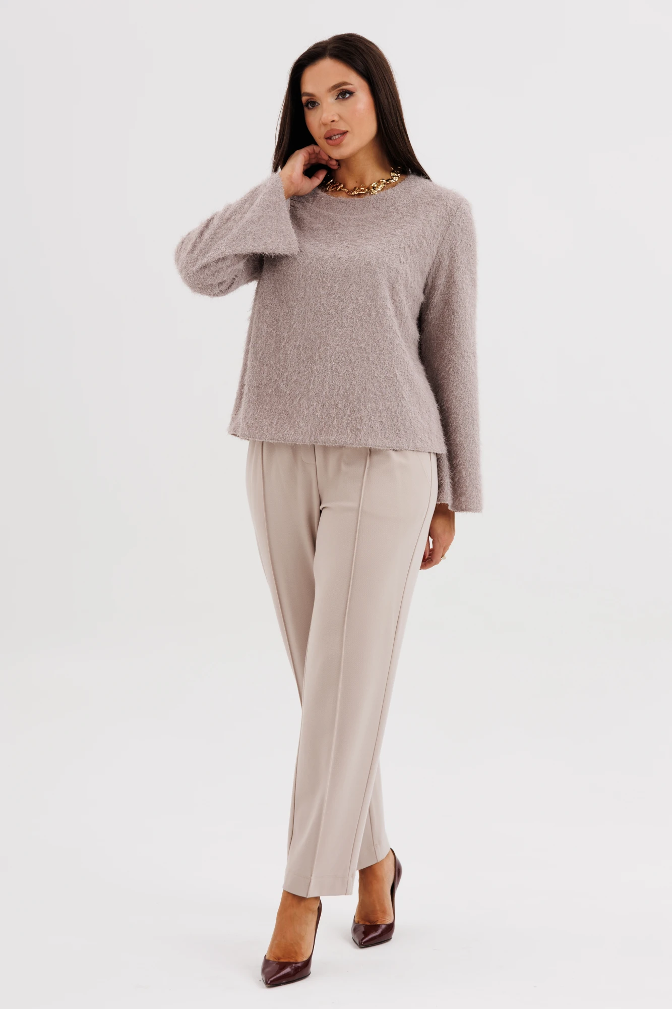Блуза выполнена из нежного трикотажа с лёгким ворсом — материал красиво драпируется и придаёт образу уют. Брюки классического кроя с высокой посадкой и застроченными стрелками визуально вытягивают силуэт и создают безупречную посадку.