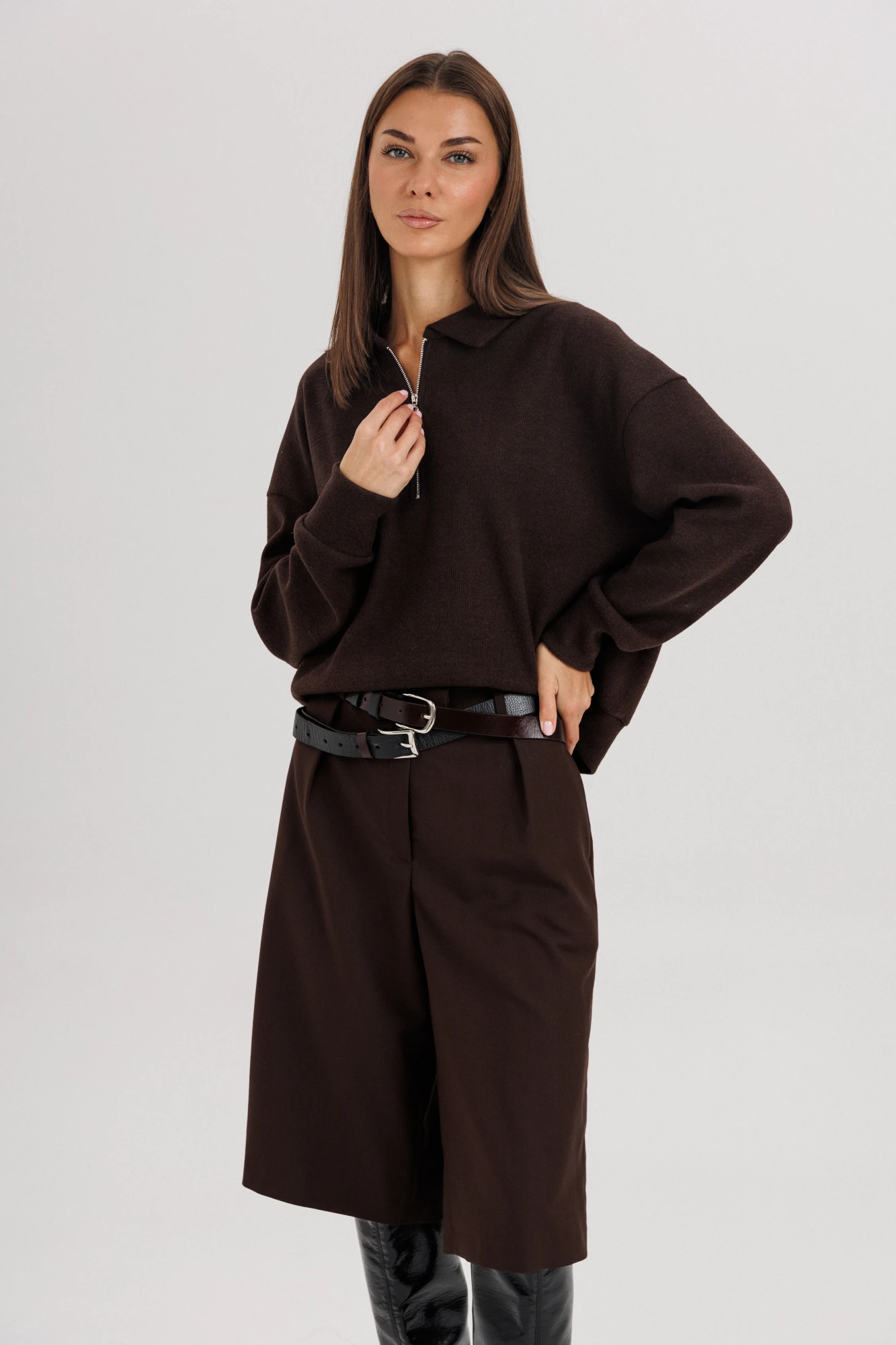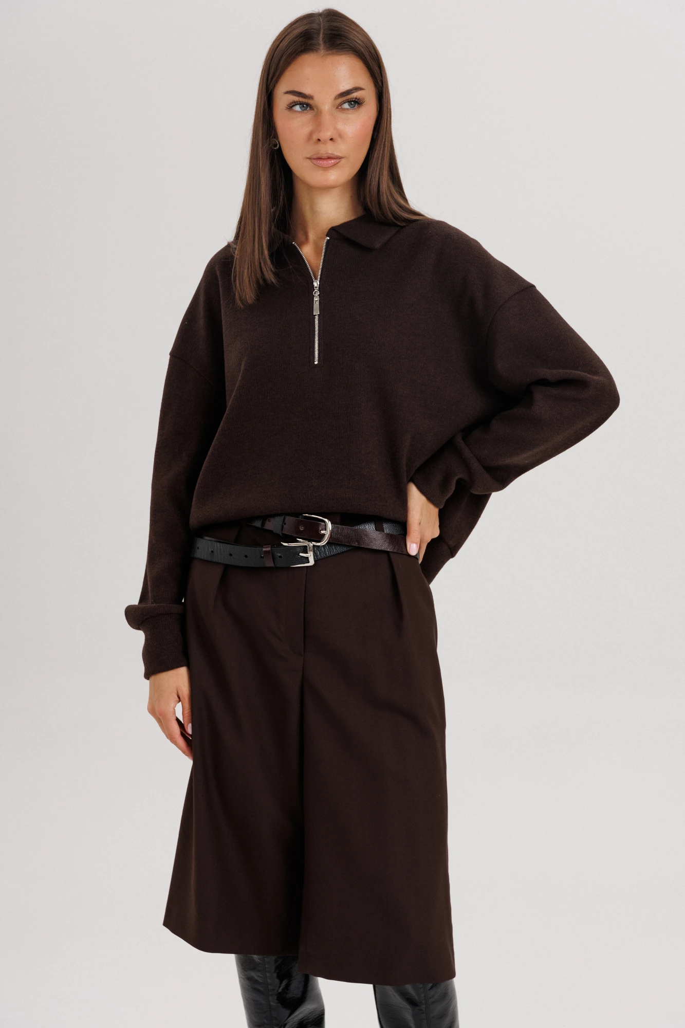 Джемпер из трикотажа. Это одна из базовых вещей осенне-зимнего сезона. Он тёплый, удобный и невероятно комфортный. К тому же, настолько универсален, что его можно стилизовать абсолютно разными способами. Свободный покрой с заниженной линией плеча, рукав рубашечного покроя на отрезной манжете, воротник классический, по центру полочки частичная застёжка-молния. По низу джемпера - отрезной пояс. Бриджи классические, прямые, на отрезном поясе со шлевками, эластичном в области спинки. Передние половинки с талиевыми вытачками и наклонными боковыми карманами.