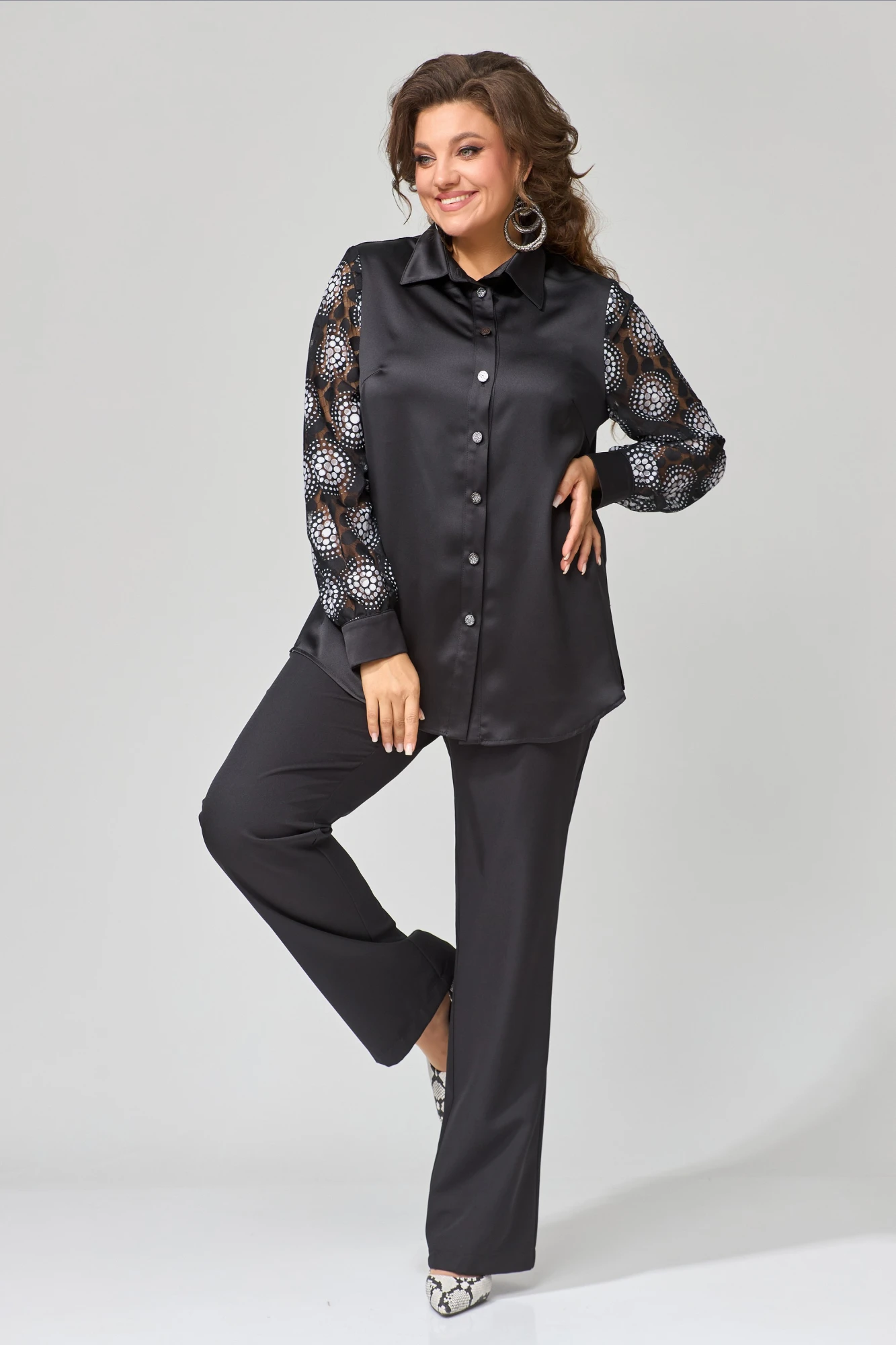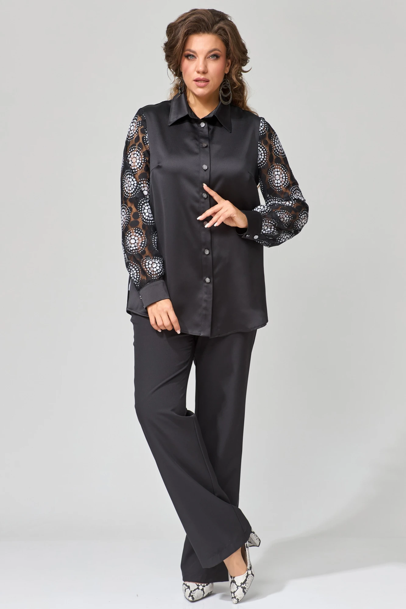 Блузка прямого силуэта с рубашечным воротником и воздушными рукавами из сетки — это игра фактур и женственности. Бантовая складка на спинке добавляет объёма, а боковые разрезы — движения.