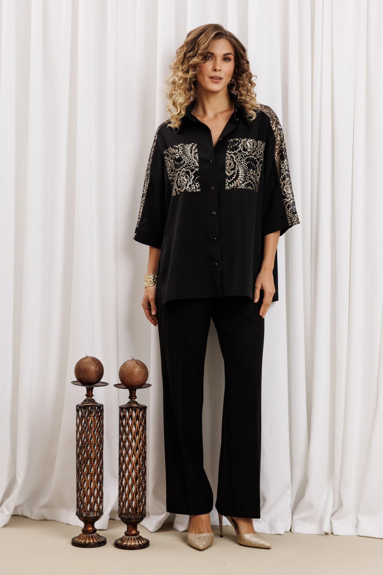 Рубашка свободного силуэта из из блузочного крепа. Застежка центральная на петли и пуговицы, воротник на стойке. В боковых швах разрезы. Рукав втачной рубашечного кроя. Карманы спереди и вставка вдоль плеча и рукава выполнеы из кружева. Длина рубашки- 71 см. длина рукава рубашки - 35 см. Брюки прямые к низу. Верх брюк на поясе со шлевками. Застежка гульфик на молнии. Фурнитура может быть изменена. Длина жакета 72 см, рукава - 60 см, брюк - 101см.
