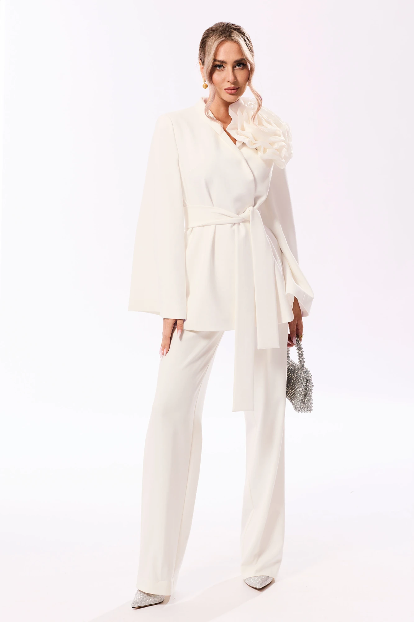 жакет свободного силуэта, с центральной двубортной застежкой на пришивные кнопки . Цельнокроеный воротник-стойка переходит в V-образный вырез горловины. По переду с выточками и полурельефами. Спинка со средним швом, рельефами, выходящими из проймы. Рукав втачной, длинный, расширенный к низу. Пояс широкий, съемный, из основной ткани. Брюки с отрезным поясом. В области спинки пояс присборен на резинку. Передние половинки с карманами, вход в карман наклонный к боковому шву. Застежка гульфик.
