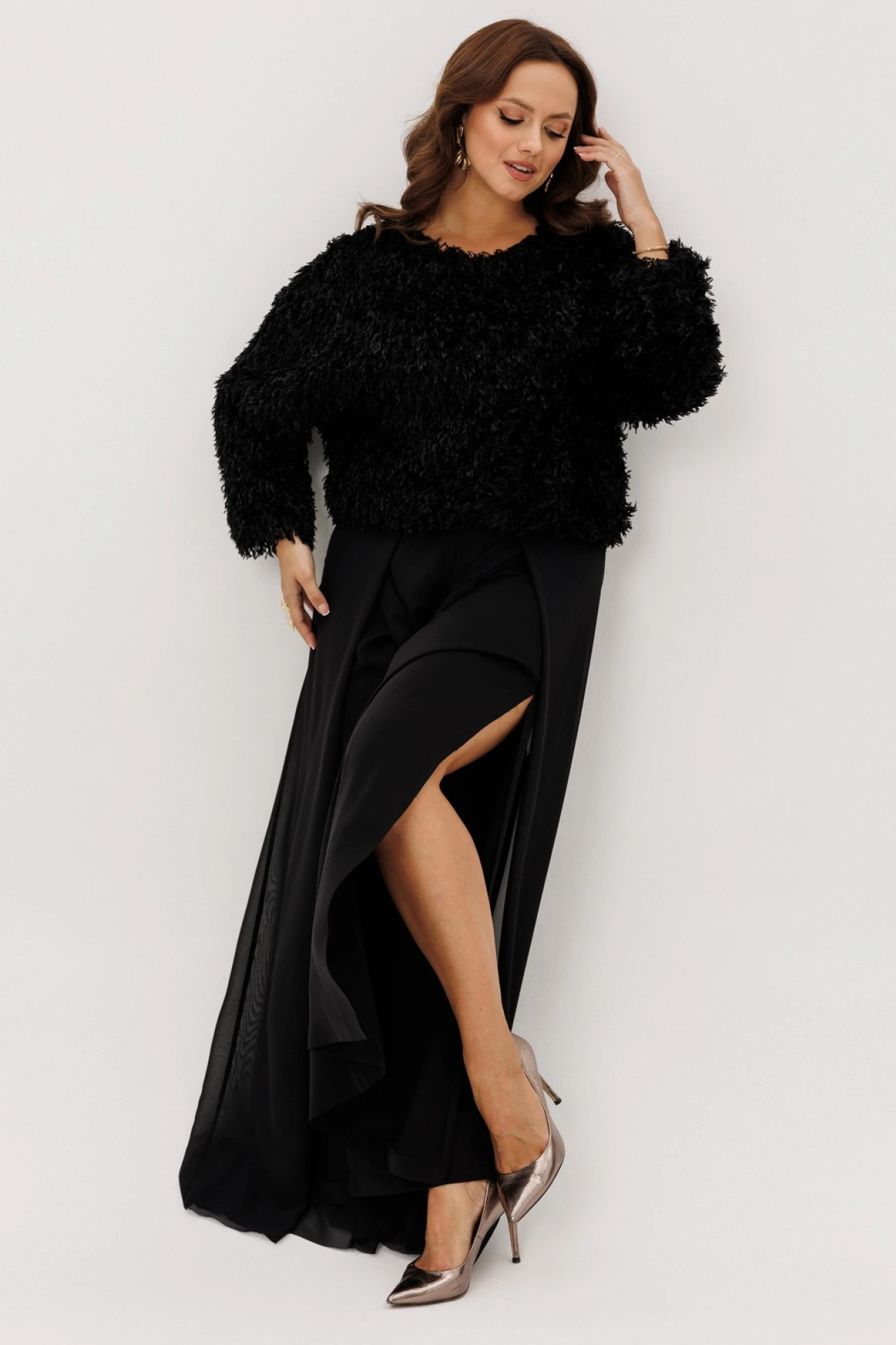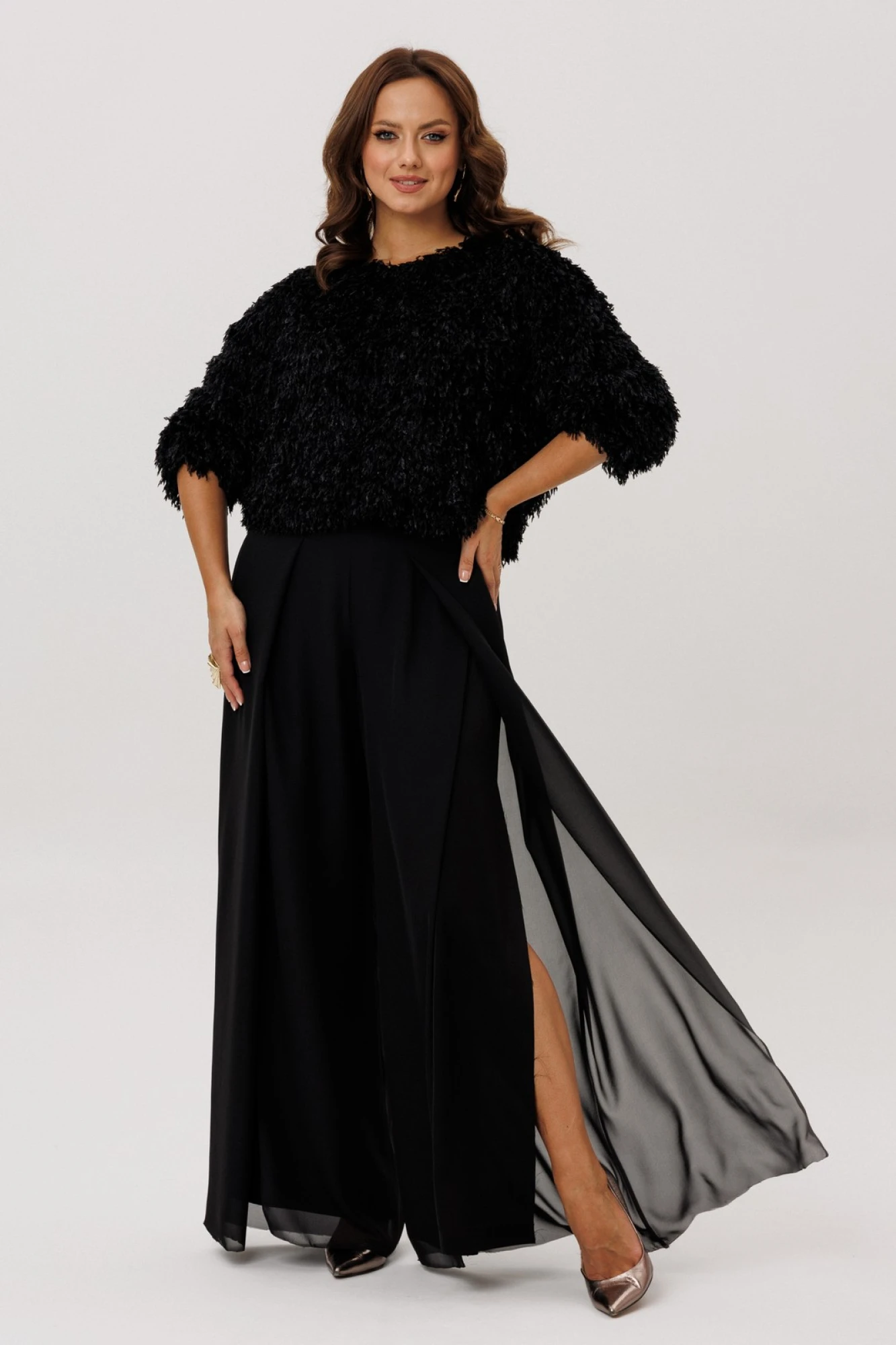 Брюки -палаццо двойные. По талии на резинке, по переду складки и разрезы. Без карманов.