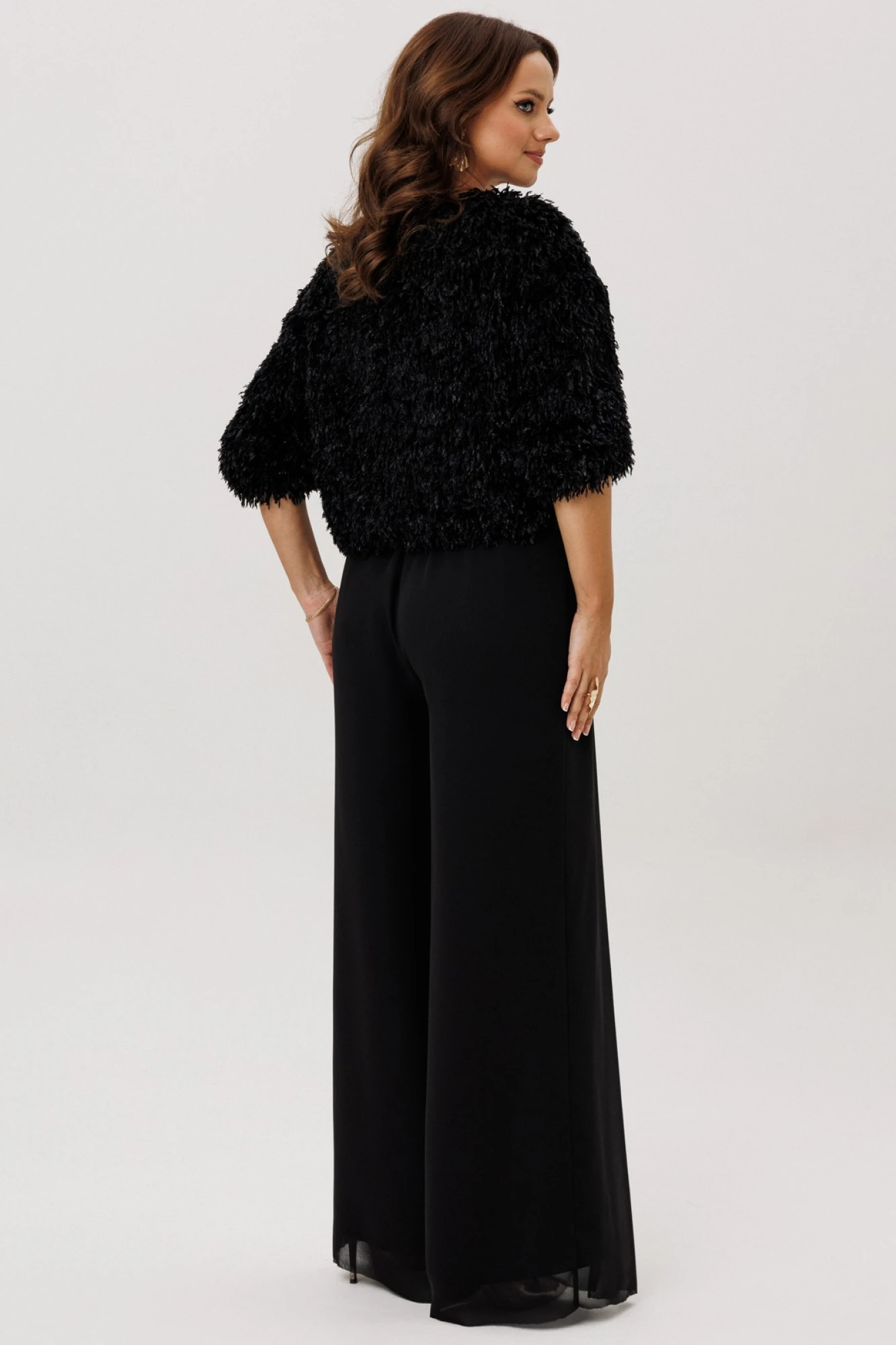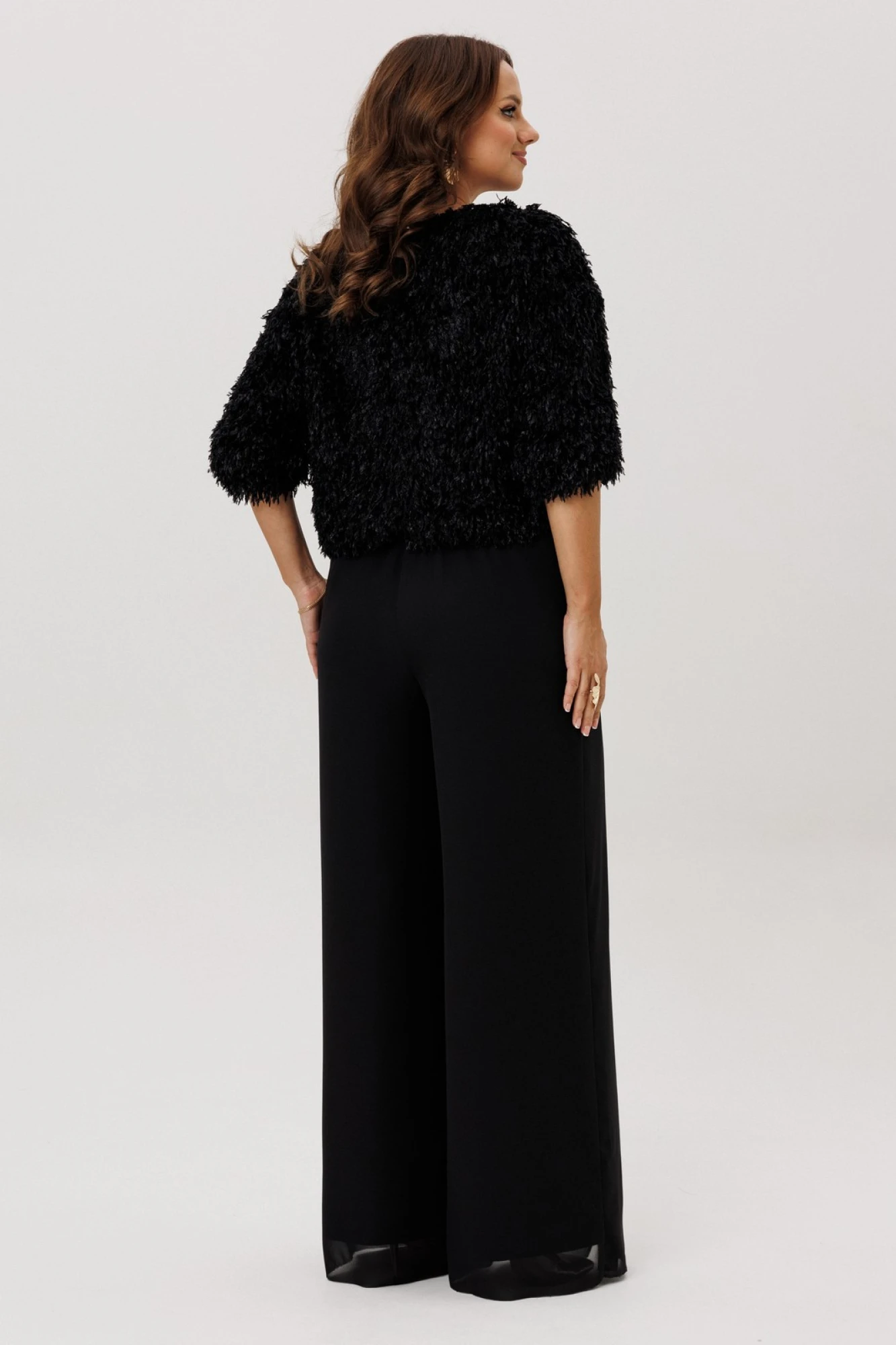 Джемпер свободного силуэта на резинке по низу и рукаве. Вырез горловины округлый, рукав цельнокроеный, застежка по спинке на петлю и пуговицу. Изделие на подкладке.