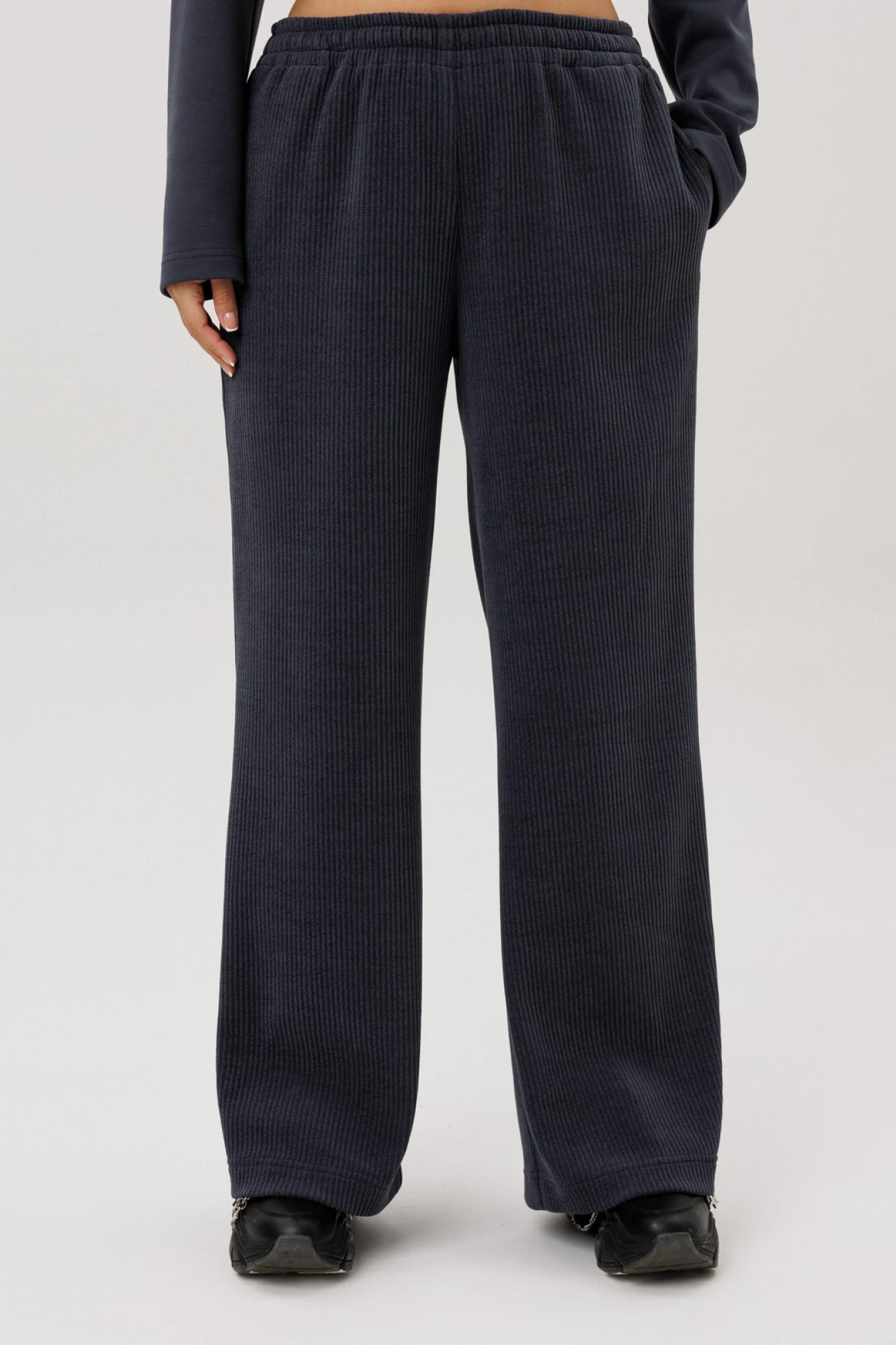 Брюки -палаццо, по талии на резинке, без застежки. В боковых швах карманы.
