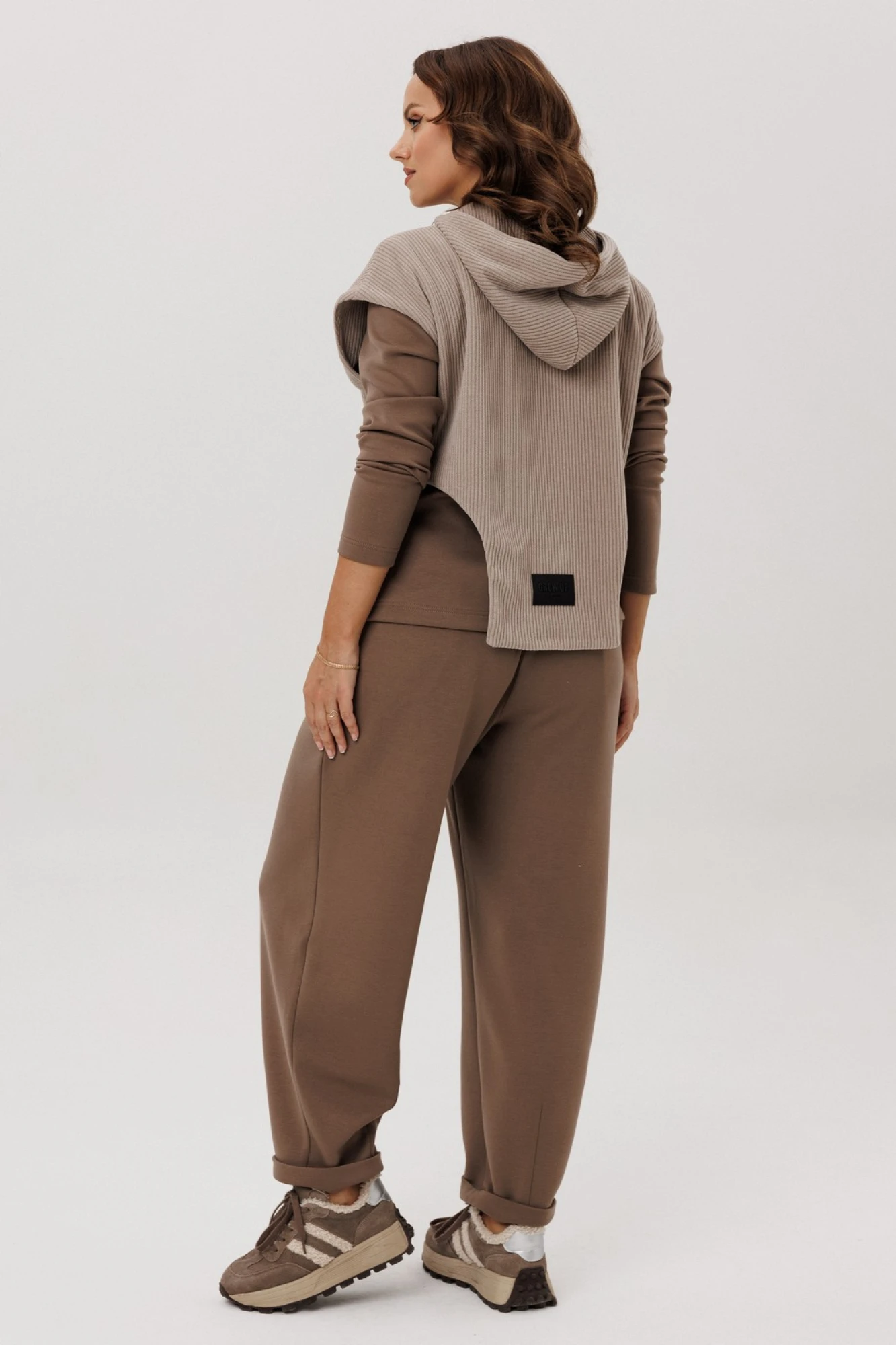 Жилет свободного силуэта с ассиметричным кроем по низу. Изделие без рукавов, с капюшоном. Застежка на тесьму-молнию по переду.