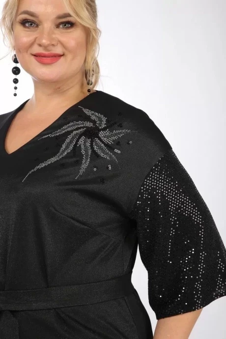 Комплект брючный 2-х предметный, нарядный, состоит из блузы и брюк. Блуза свободного силуэта изготовлена из трикотажного полотна. Горловина V-образной формы обработана обтачкой. Перед со средним швом декорирован вышивкой. Спинка цельная. Рукав спущенный, из отделочной ткани с пайетками. Пояс из основной ткани. Брюки средней посадки изготовлены из костюмно-плательной ткани, прямого силуэта. По передним деталям обработаны боковые карманы. Пояс обтачной. Застежка на молнию и петли и пуговицы.