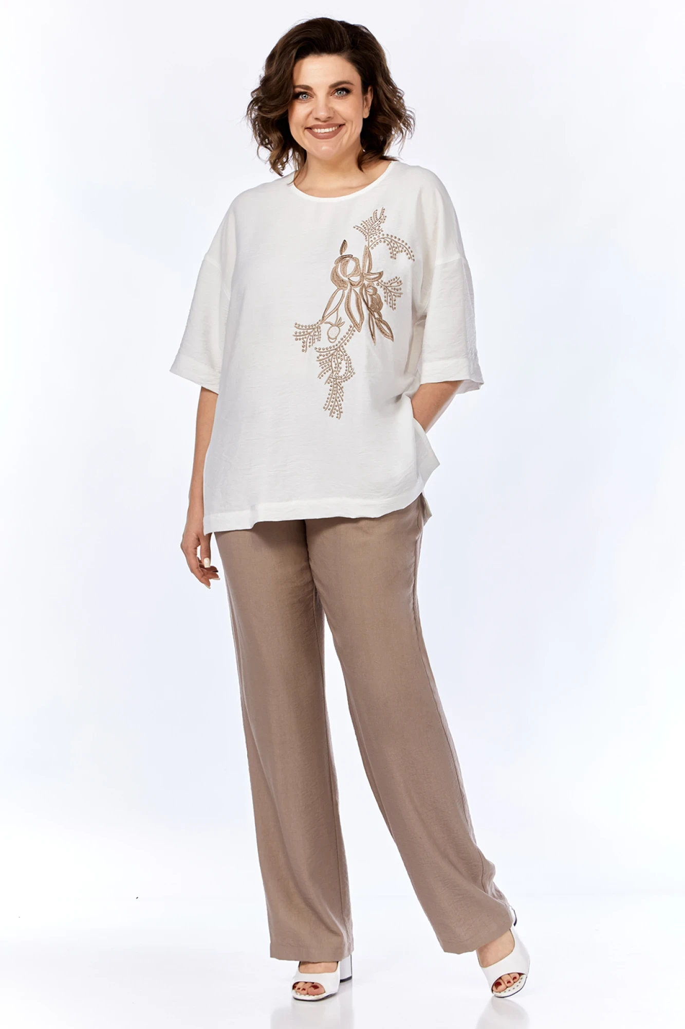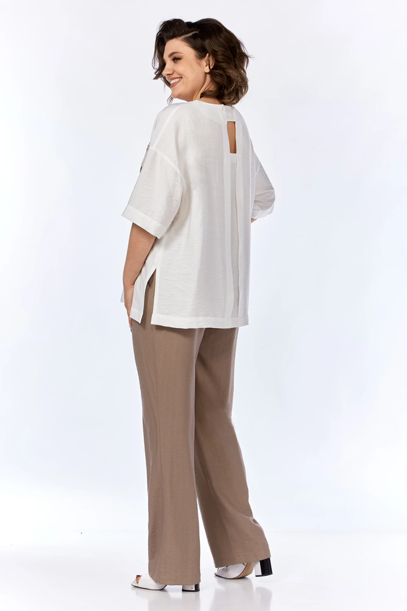 Комплект брючный изготовлен из легкой вискозной ткани с эффектом мятости. Блузка свободного силуэта. Перед с дизайнерской вышивкой, спинка с декоративными элементами по центру. В боковых швах обработаны разрезы. Рукава спущенные. Брюки прямого силуэта средней посадки. Пояс притачной на резинке. На передней части брюк обработаны карманы с подрезным бочком.