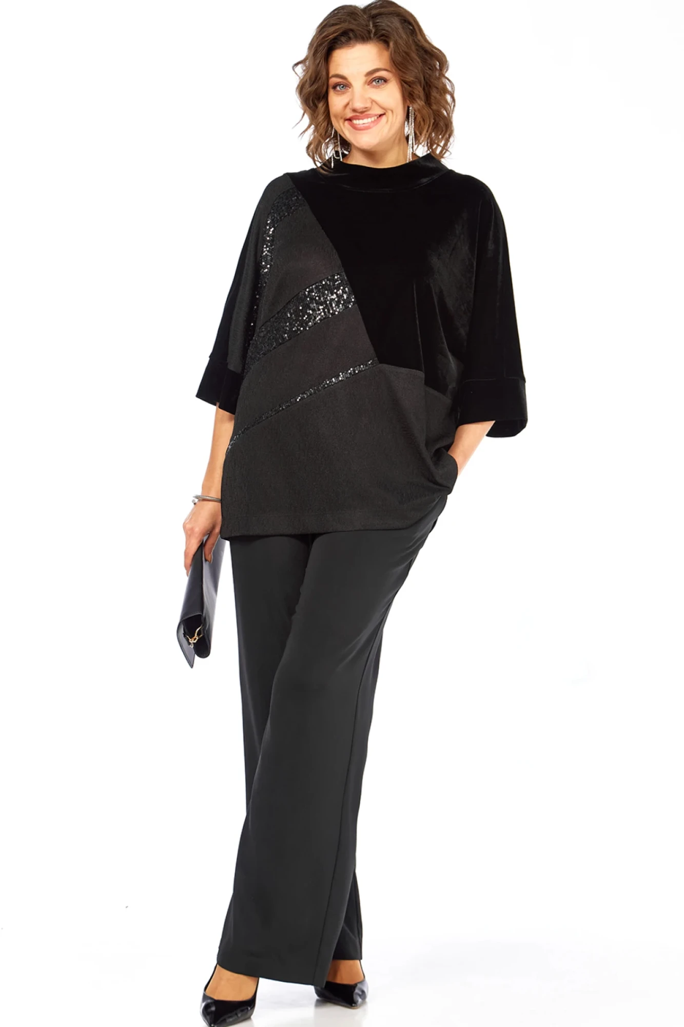Комплект брючный, нарядный, состоит из джемпера и брюк. Джемпер женский, свободного кроя. Выполнен путем комбинирования трикотажного полотна и бархата, с декоративными вставками из пайеток по переду. Горловина обработана воротником стойкой. Рукава цельнокроеные с притачными манжетами. Брюки прямого силуэта из костюмно-плательной ткани. Пояс притачной на резинке. В брюках обработаны карманы.