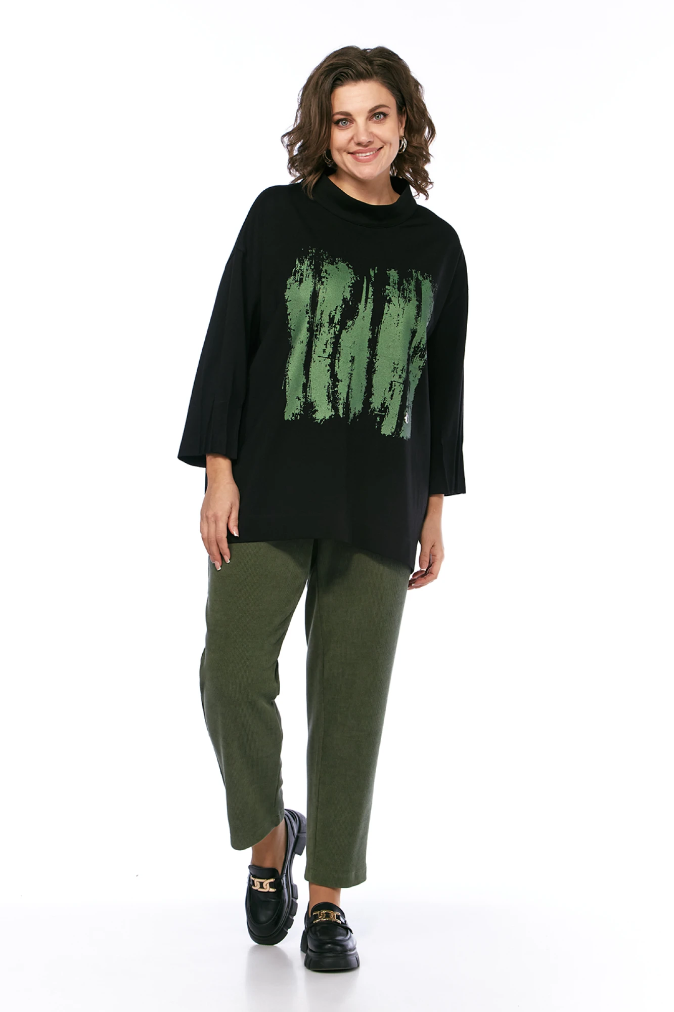 Комплект брючный двухпредметный, состоит из джемпера и брюк. Джемпер свободного силуэта, выполнен из трикотажного полотна. Горловина обработана воротником-стойка. Перед и спинка цельнокроеные. Рукава спущенные с защипами. Джемпер дополнен дизайнерской печатью. Брюки средней посадки, выполнены из вельветовой ткани. Заужены к низу. Пояс притачной со вставками с эластичной тесьмой. Застежка на молнию и петлю с пуговицей. В передних деталях брюк карманы с подрезным бочком.