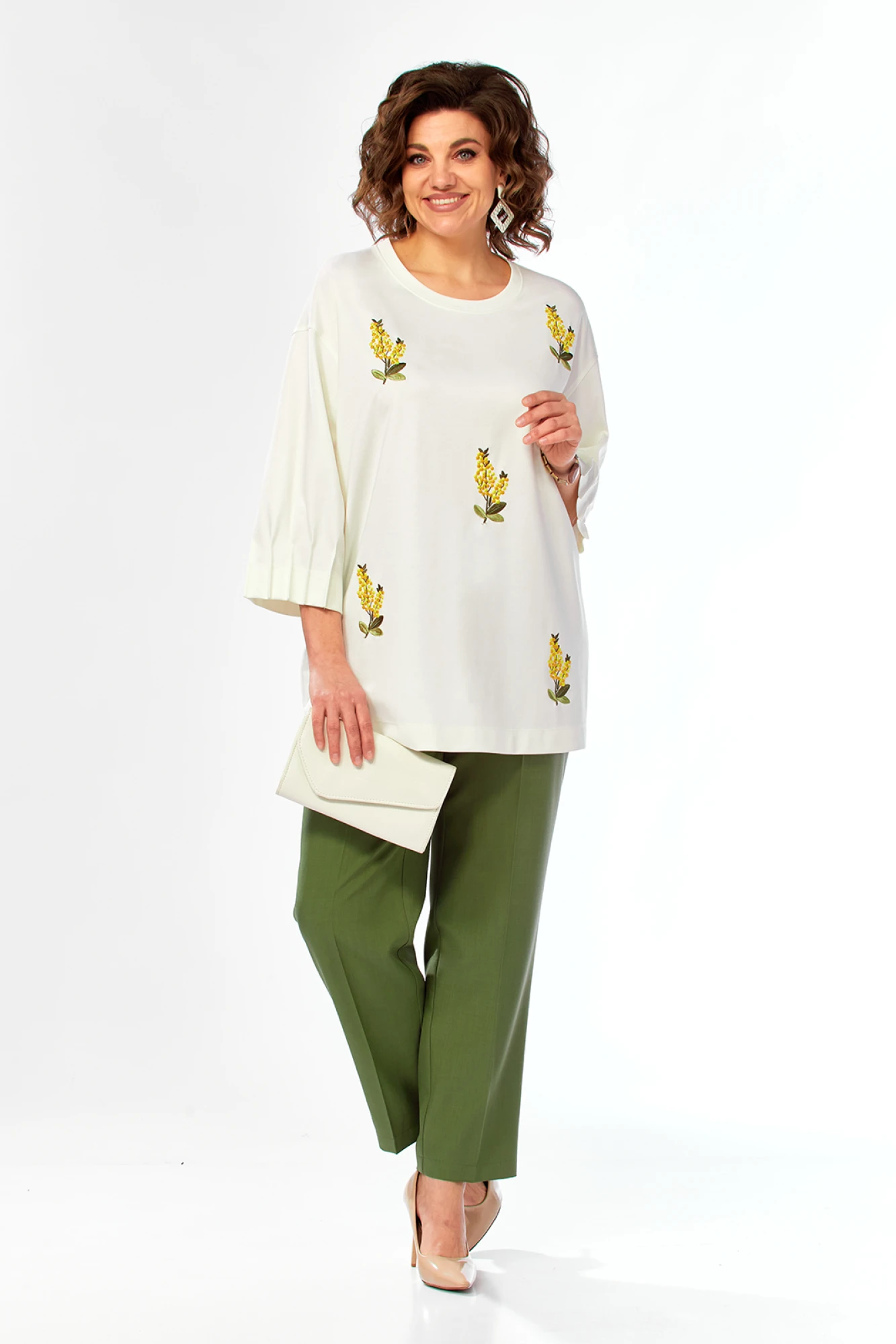 Комплект брючный двухпредметный, состоит из джемпера и брюк. Джемпер свободного силуэта выполнен из трикотажного полотна. Горловина обработана бейкой. Перед и спинка цельнокроеные. Рукава спущенные, по низу застрочены защипы . Джемпер декорирован дизайнерской вышивкой. Брюки классической посадки, выполнены из костюмной ткани. Пояс притачной , частично на эластичной тесьме, застежка на петлю и пуговицу. В передних деталях обработаны карманы с подрезным бочком.