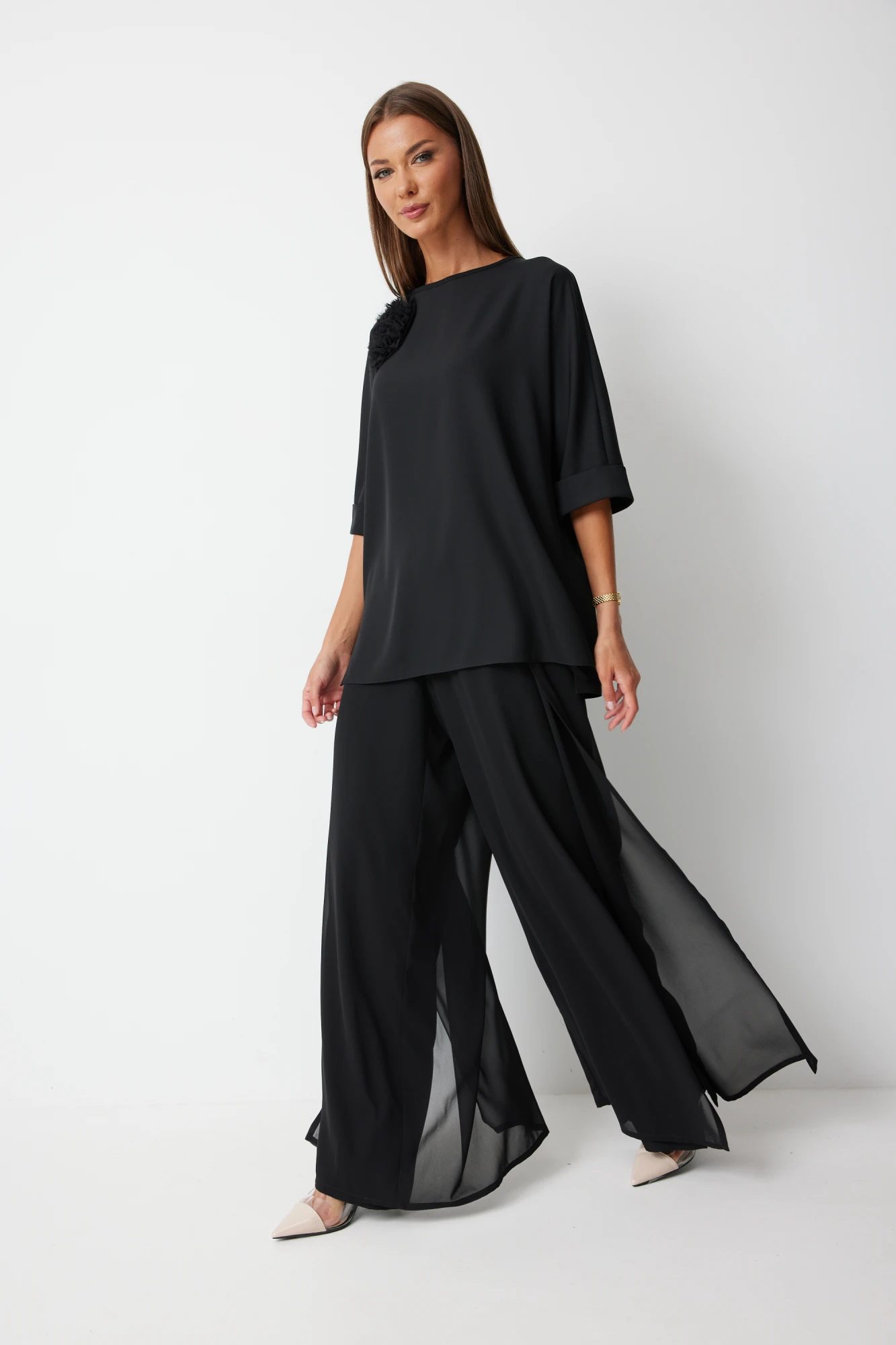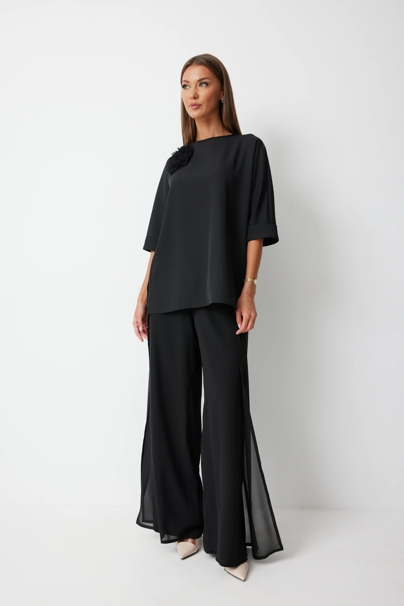Костюм состоит из блузы и брюк. Блуза женская прямого силуэта закрывающая линию паха с цельнокроеными рукавами. К блузке прилагается съёмный декор – цветок. По боковым швам располагаются разрезы. Спинка с центральным швом и застежкой на навесную петлю и пуговицу. Горловина обработана косой бейкой. Рукав до локтя, низ рукава обработан отрезной отворачивающейся манжетой, закрепленной по швам. Низ блузки обработан швом «в подгибку». Брюки прямого силуэта, выполнены из шифоновой ткани на подкладке полной длинны. Боковой шов брюк открыт. Синка брюк заходит на перед по верхней части. Подкладка из не просвещающейся креповой ткани. Верх брюк обработан отрезным поясом. Центральная часть пояса без резинки, остальной пояс на резинке. Низ брюк обработан швом « в подгибку». Цвет материала может отличаться по тону в зависимости от настроек вашего монитора!.